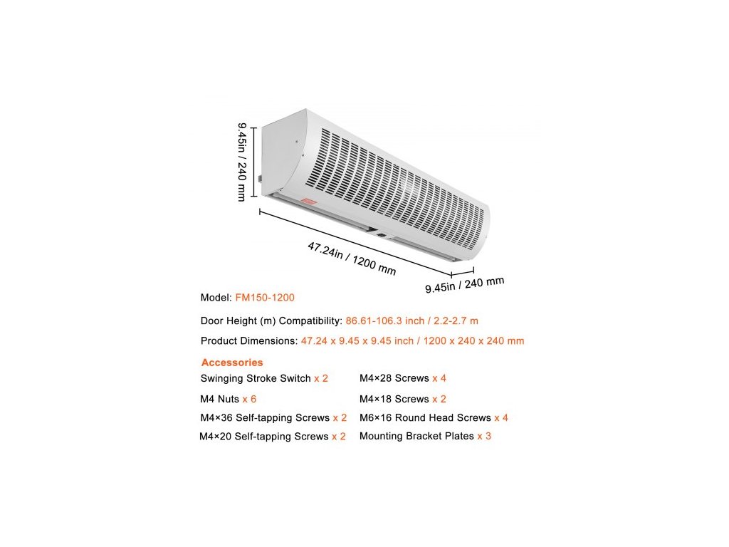 Vhodné pro výšku dveří: 85,83 - 104,33 palce / 2,2-2,7 m, Max. průtok vzduchu (CFM/m³/h): 1650/2802, Napětí: AC220-240V 50/60Hz, Model: FM150-1200-E, Rozměry produktu: 47,24 x 9,45 x 9,45 palce / 1200 x 240 x 240 mm,Barva: Bílá