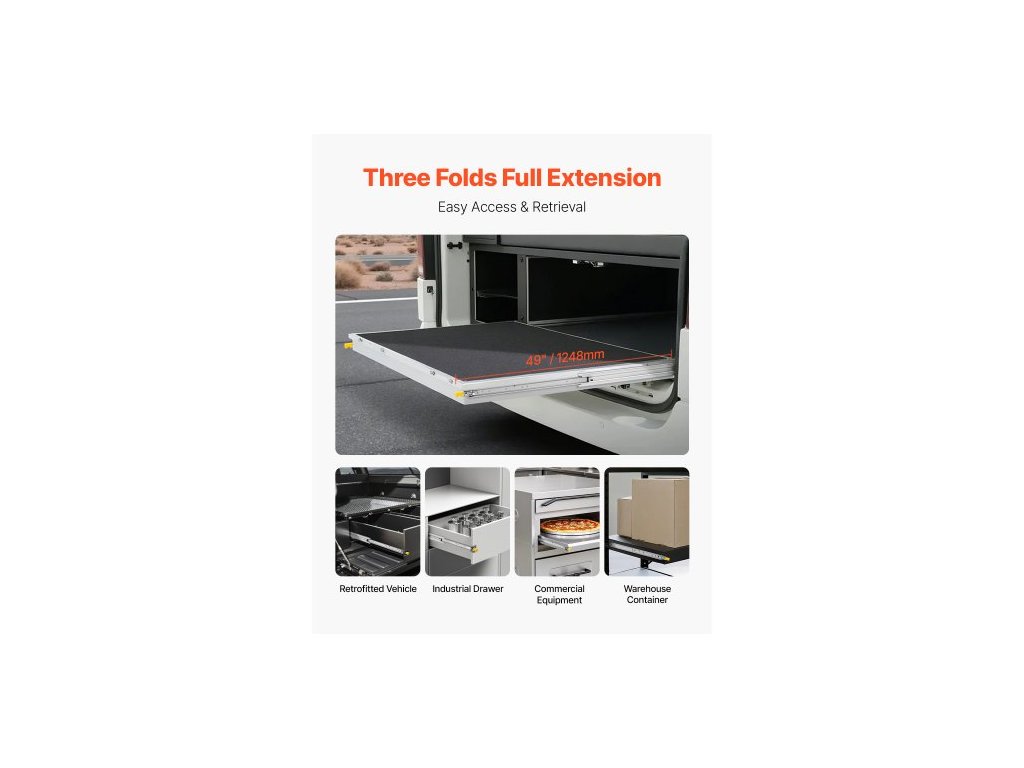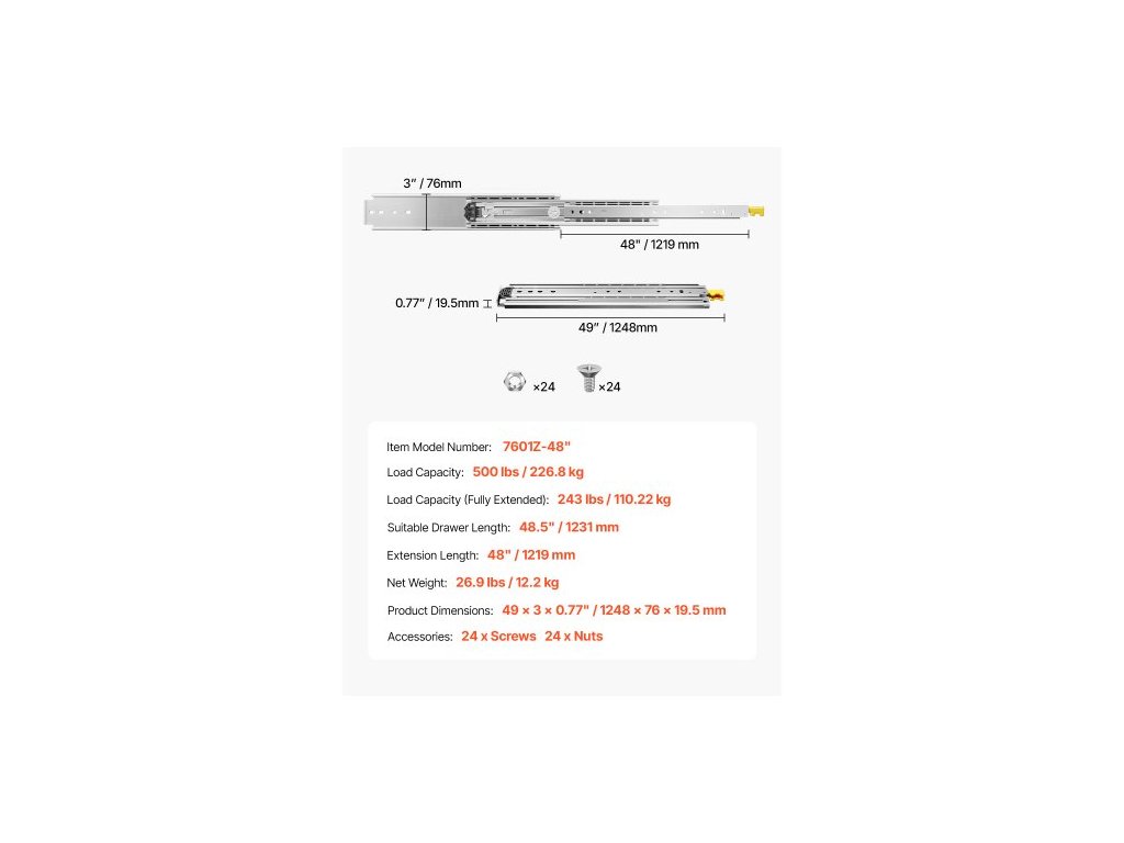 1 pár plně výsuvných výsuvů pro zásuvky 18 20 22 28 30 32 36 38 40 44 48 52 56 60 palců, nosnost 500 liber, uzamykatelné výsuvy pro zásuvky, kuličkové ložisko se zámkem, boční montáž, nosnost 500 liber, zaručená bezpečnost, robustní a odolné, všestranné, snadná a rychlá montáž, uživatelsky přívětivý design, vhodná délka zásuvky: 48,5" / 1231 mm, délka výsuvu: 48" / 1219 mm, nosnost: 500 liber / 226,8 kg, číslo modelu položky: 7601Z-48", rozměry výrobku: 49 x 3 x 0,77" / 1248 x 76 x 19,5" mm, Nosnost (plně vysunutá): 110,22 kg, Čistá hmotnost: 12,2 kgDoplňkové parametry