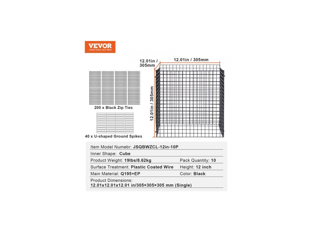 Vnitřní tvar: Krychle,Číslo modelu položky: JSQBWZCL-12in-10P,Množství v balení: 10,Barva: Černá,Povrchová úprava: Drát s plastovým potahem,Hmotnost výrobku: 19lbs/8,62 kg,Výška: 12 palců,Rozměry výrobku: 12,01x12,01x12,01 in/305×305×305 mm (jeden kus),Hlavní materiál: Q195+EP