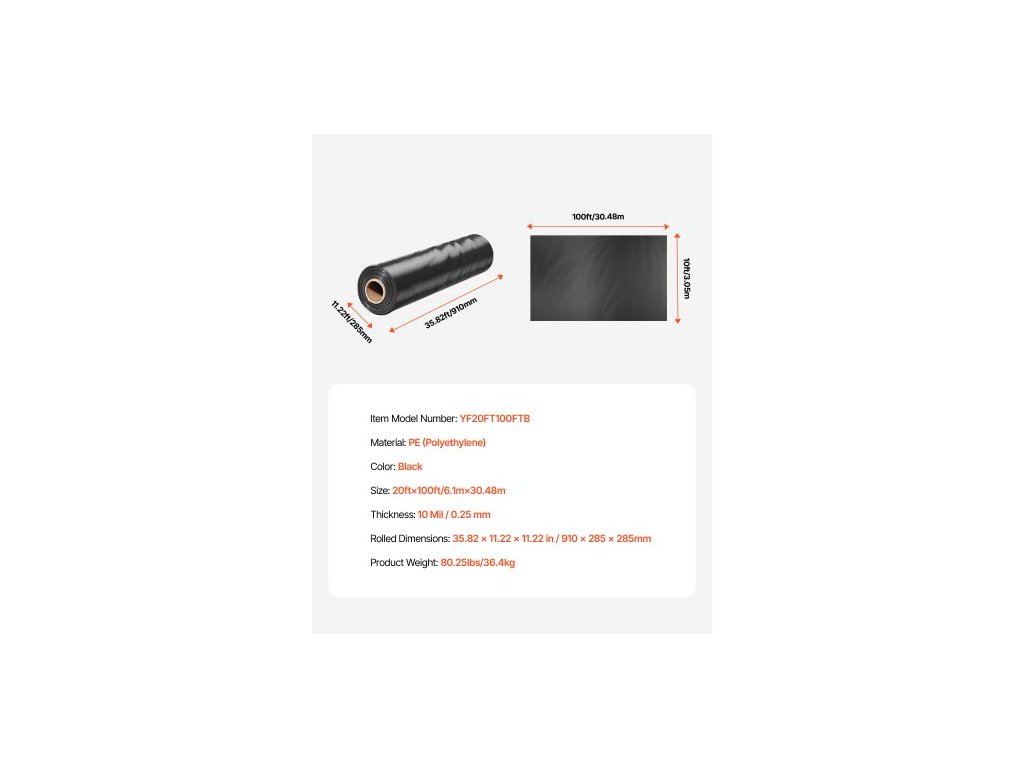 Tloušťka: 10 Mil / 0,25 mm,Rozměr: 20 × 100 stop (6,96 m × 30,48 m),Barva: Černá,Číslo modelu položky: YF20FT100FTB,Hmotnost výrobku: 78,04 lbs / 35,4 kg,Materiál: PE (polyethylen),Rozměry v rolích: 35,82 x 11,22 x 11,22 palce / 910 x 285 x 285 mm