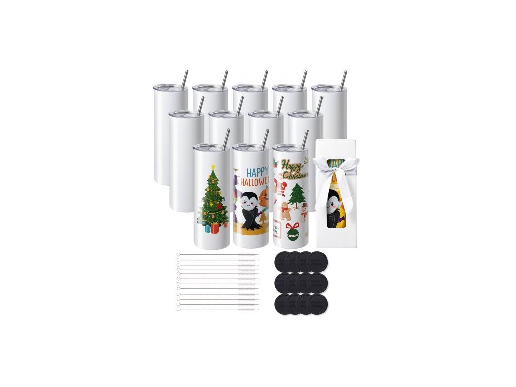 12 kusů rovných sublimačních sklenic, 591,5 ml prázdné sklenice, nerezové dvoustěnné sklenice s brčkem, víčkem, štětcem, základnou, smršťovací fólií, dárkovou krabičkou, pro tepelný lis a přenos tepla