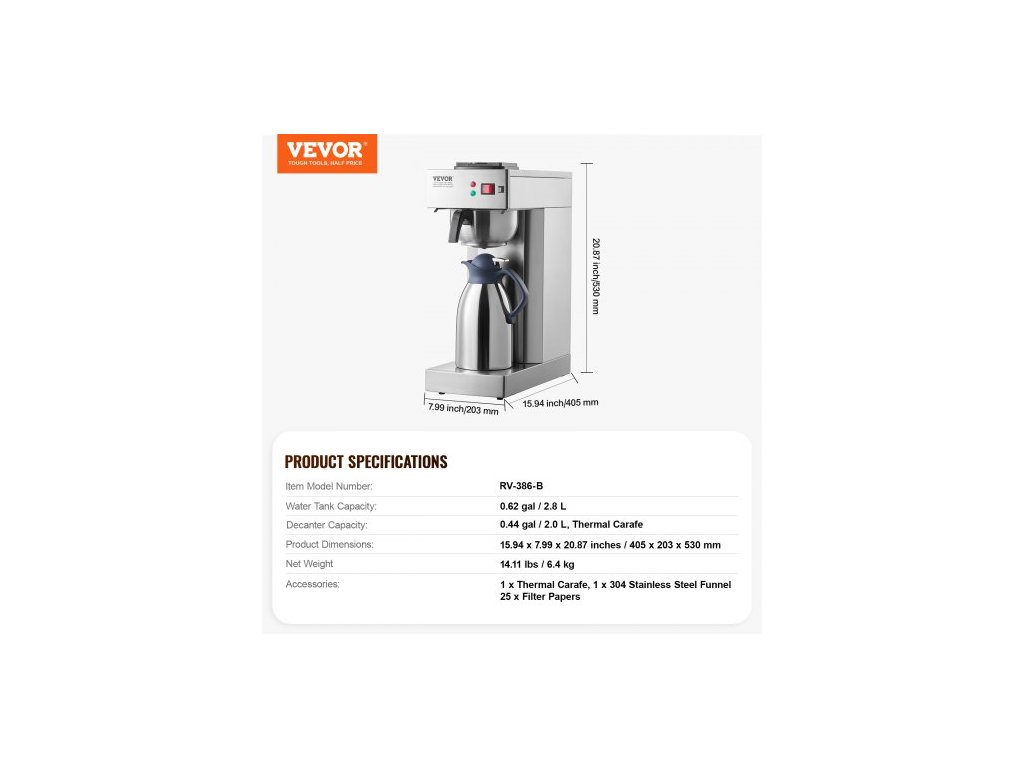 Objem nádržky na vodu: 2,8 l,Číslo modelu: RV-386-B,Objem karafy: 2,0 l,Termografická karafa,Rozměry výrobku: 405 x 203 x 530 mm,Čistá hmotnost: 6,4 kg