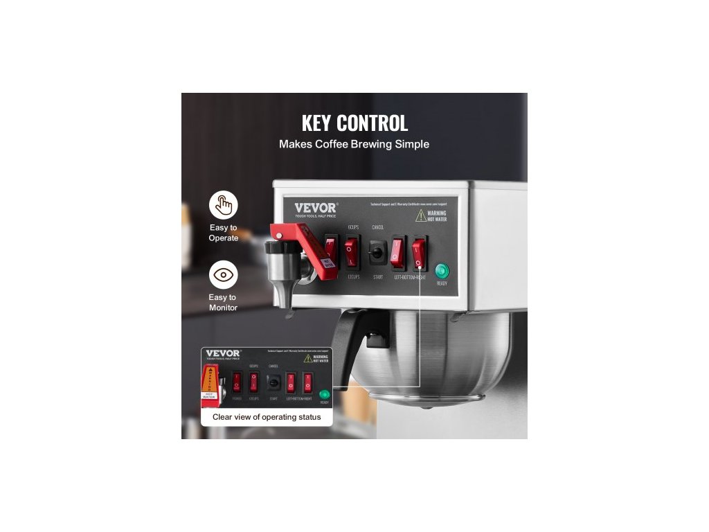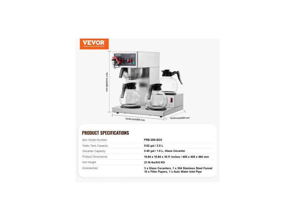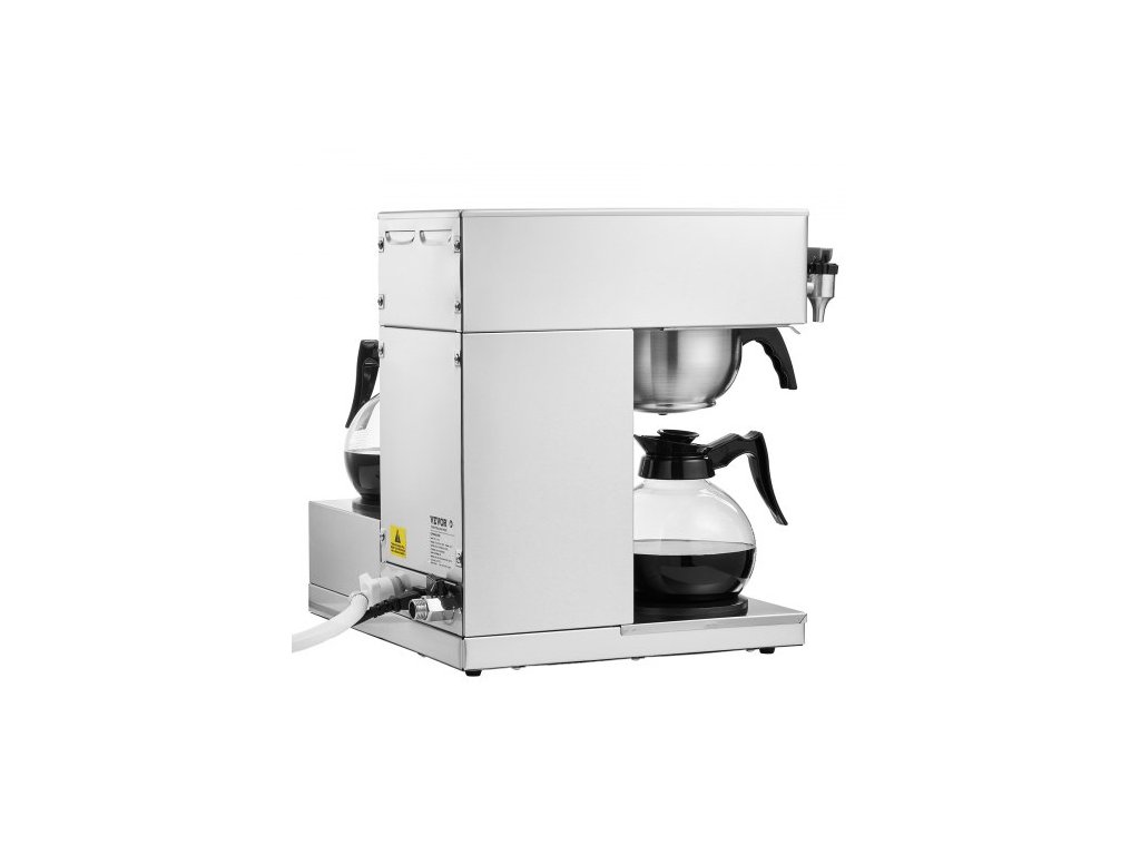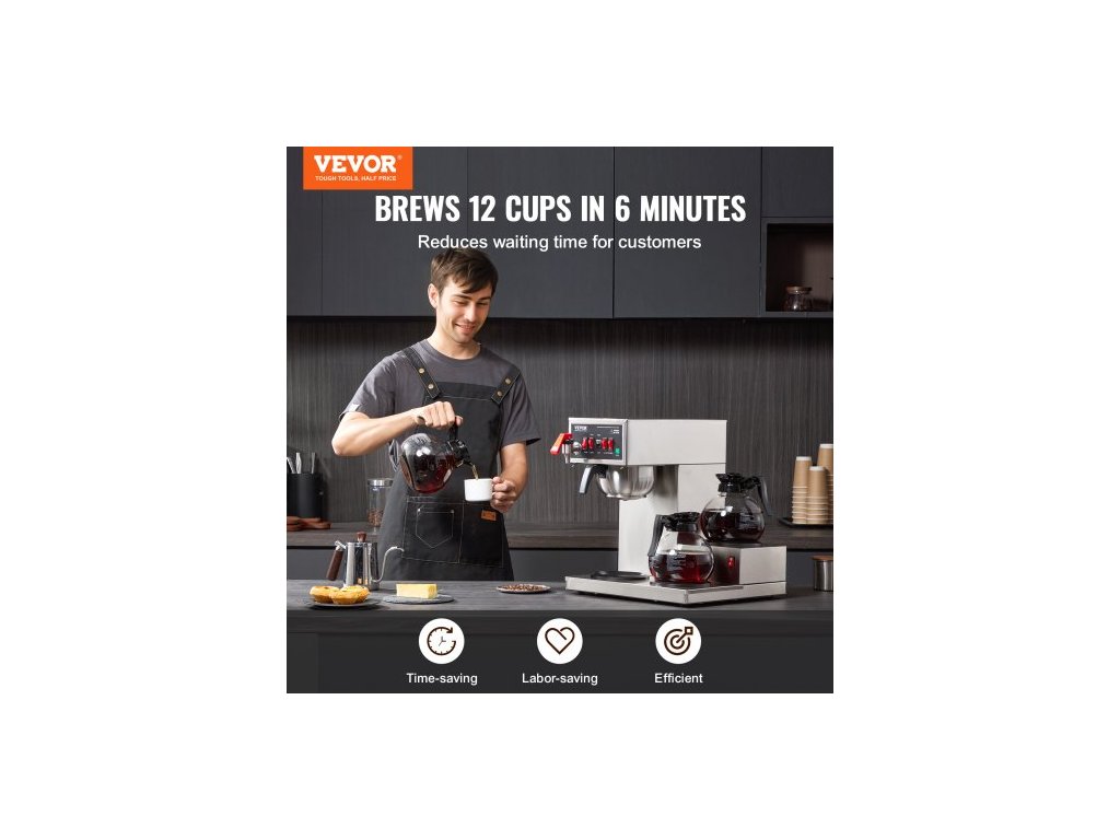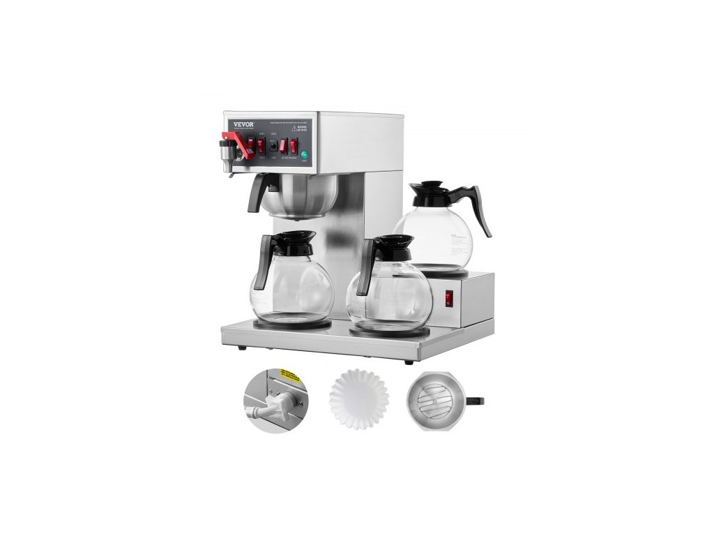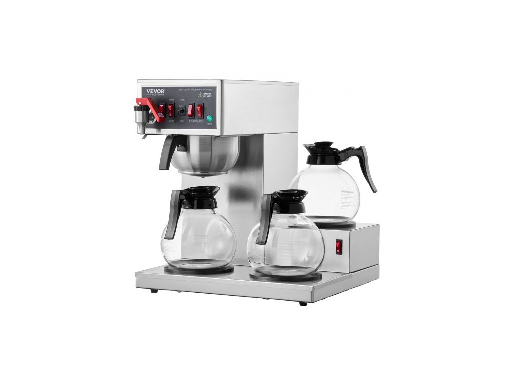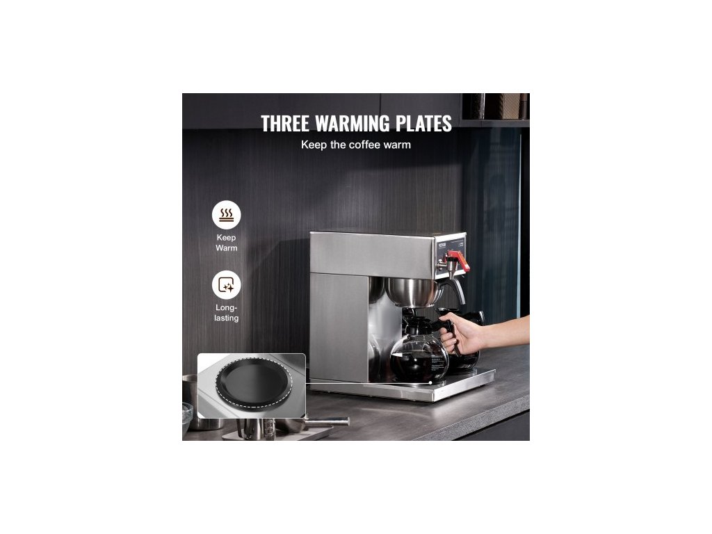 Komerční překapávací kávovar na 12 šálků, kávovar se 3 skleněnými karafami a 3 ohřívacími destičkami, nerezový přelévací kávovar pro restaurace, kanceláře, kavárnyEfektivní příprava kávy