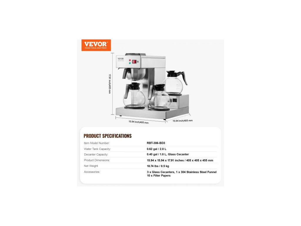 Objem nádržky na vodu: 0,62 gal / 2,8 l,Číslo modelu položky: RBT-386-BD3,Objem karafy: 0,40 gal / 1,8 l,Skleněná karafa,Rozměry výrobku: 15,94 x 15,94 x 17,91 palců / 405 x 405 x 455 mm,Čistá hmotnost: 18,74 lbs / 8,5 kg