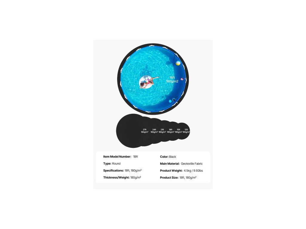 18 stop kulatá podložka pod bazén, podložka pod bazén pro nadzemní bazény, podložka pod bazén zabraňuje propíchnutí, podložky z recyklovaného geotextilie, prodloužení životnostiOchraňte fólii svého bazénu