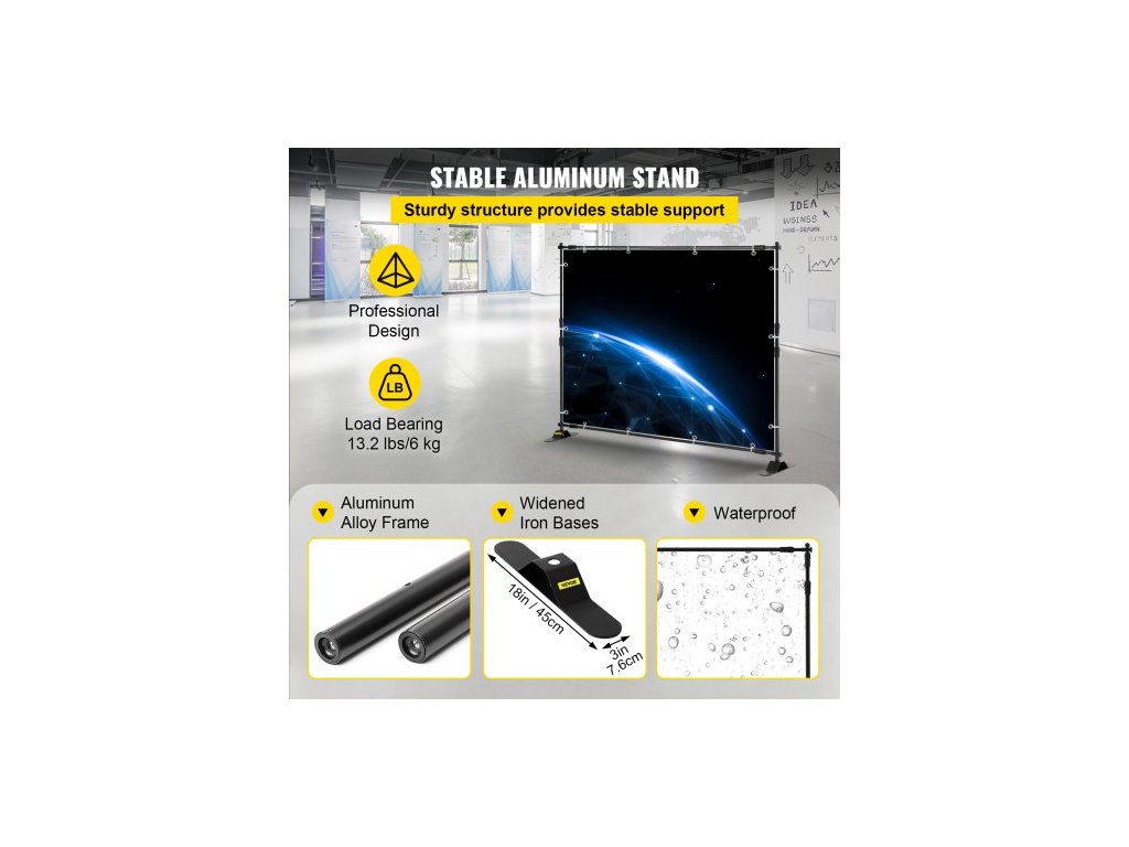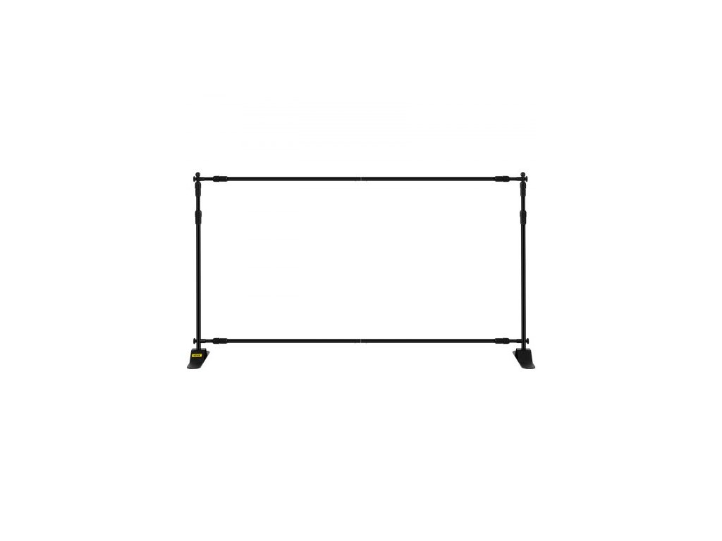 Rozsah šířky: 1,4 m - 2,4 m,Tloušťka stěny trubky: 1 mm,Nosnost: 6 kg,Výškový rozsah: 1,1 m - 2,4 m,Rozměry základny (D x Š): 45 cm x 7,6 cm,Barva: Černá,Minimální velikost grafiky (Š x V): 1,1 m x 1,4 m,Hmotnost výrobku: 5,4 kg,Materiál rámu: Hliník, Max. velikost grafiky (Š x V): 1,4 m x 2,4 m, Základní materiál: Železo
