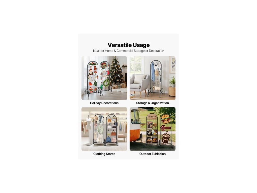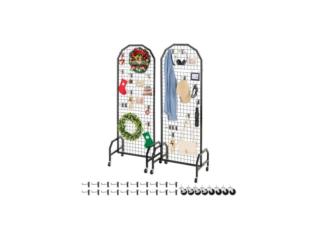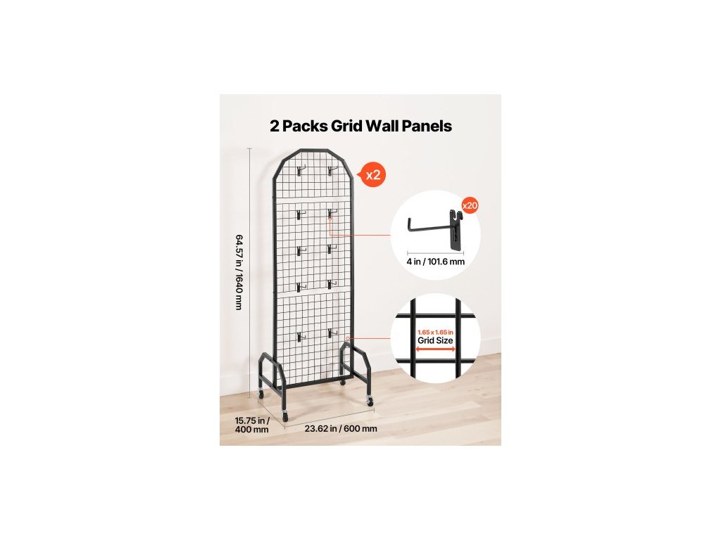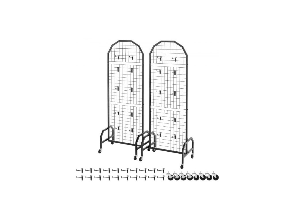 2 balení mřížkových nástěnných panelů, 600 x 1640 mm drátěné mřížkové panely, stojan na vystavení umění, pohyblivá police s kolečky a 20 háčky, černá mřížková stěna z uhlíkové oceli pro řemeslné výstavy, dekorace, úložný prostor, nástěnku