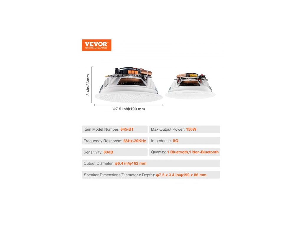 Citlivost: 89 dB,Číslo modelu položky: 645-BT,Množství: 2 ks,Frekvenční odezva: 68 Hz-20 kHz,Impedance: 8 Ω,Rozměry reproduktoru (průměr x hloubka): φ7,5 x 3,4 palce/φ190 x 86 mm,Maximální výstupní výkon: 150 W,Průměr výřezu: 6,4 palce/162 mm