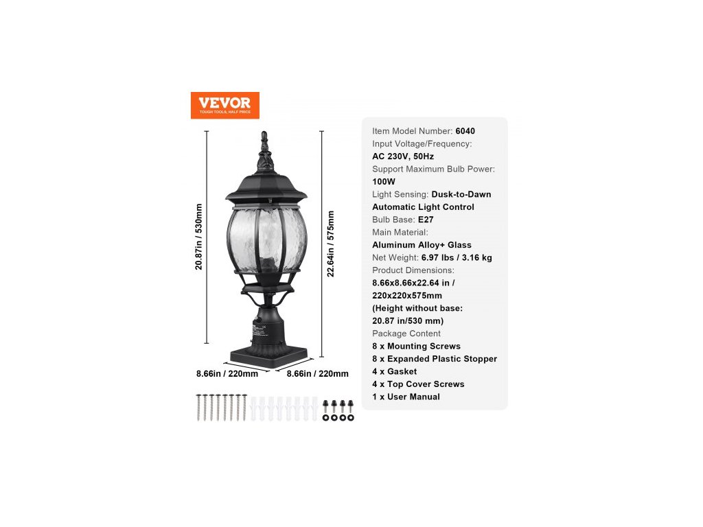 Patic žárovky: E27, Podpora maximálního výkonu žárovky: 100 W, Snímání světla: Automatické ovládání světla od soumraku do úsvitu, Číslo modelu položky: 6040, Rozměry produktu: 8,66 x 8,66 x 22,64 palce / 220 x 220 x 575 mm (Výška bez základny: 20,87 palce/530 mm), Vstupní napětí/frekvence: AC 230 V, 50 Hz, Čistá hmotnost: 6,97 3,16 kg, Hlavní materiál: Hliníková slitina + sklo