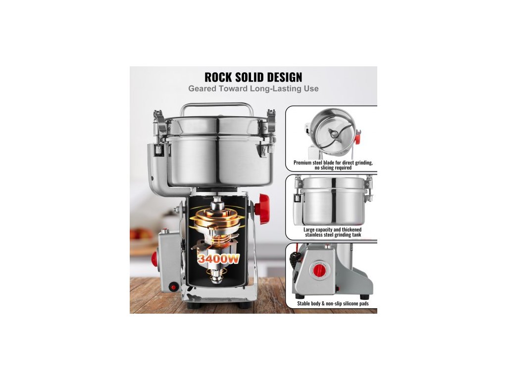 2000g elektrický mlýnek na obilí, vysokorychlostní 3400W komerční mlýnky na koření, nerezový drtič na prášek, na suché obiloviny, koření, obiloviny, kávu, kukuřici, pepř, kyvný typ