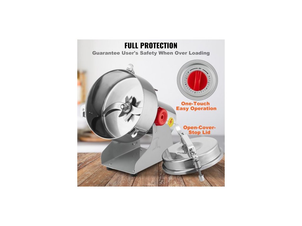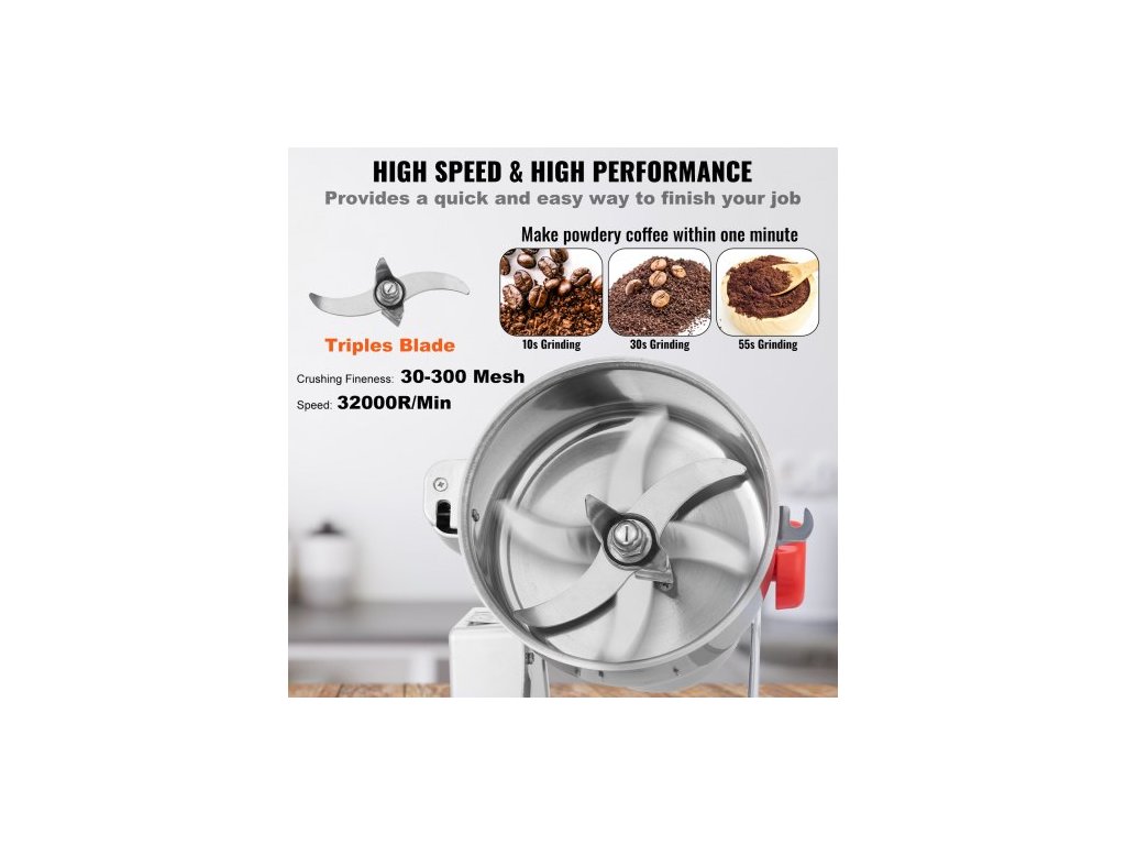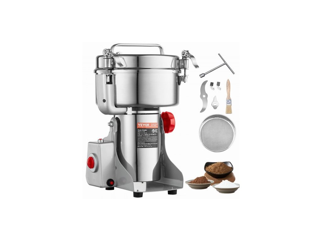 Elektrický mlýnek na obilí 2000g, vysokorychlostní komerční mlýnky na koření s výkonem 3400 W, drtič z nerezové oceli, na suchá zrna, koření, obiloviny, kávu, kukuřici, pepř, výkyvný typVelký zásobník