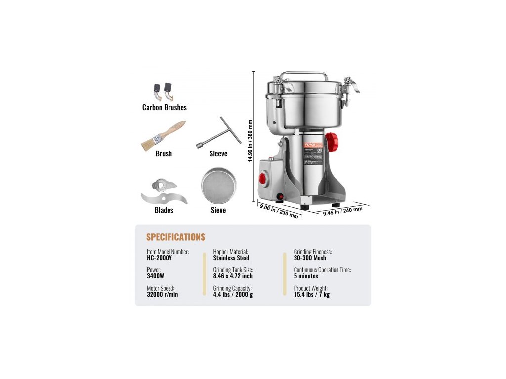 Otáčky motoru: 32000 ot/min,Rozměry výrobku (D x Š x V): 9,45 x 9,06 x 14,96 palce / 240 x 230 x 380 mm,Materiál zásobníku: nerezová ocel 403,Rozměry mlecí nádrže: 8,46 x 4,72 palce / 21,5 x 12 cm,Číslo modelu položky: HC-2000Y,Hmotnost výrobku: 15,4 lbs / 7 kg,Mletí: 4,4 lbs / 2000 g, Doba nepřetržitého provozu: 5 minut, Jemnost mletí: 30-300 mesh, Výkon: 3400 W