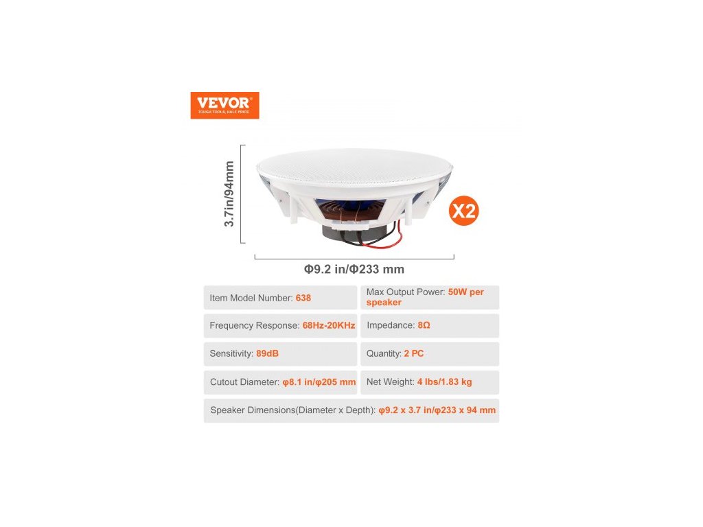 Citlivost: 89 dB,Číslo modelu položky: 638,Množství: 2 ks,Frekvenční odezva: 68 Hz-20 kHz,Impedance: 8 Ω,Rozměry reproduktorů (průměr x hloubka): φ9,2 x 3,7 palce/φ233 x 94 mm,Čistá hmotnost: 4 lbs/1,83 kg,Maximální výstupní výkon: 50 W na reproduktor,Průměr výřezu: 8,1 palce/205 mm