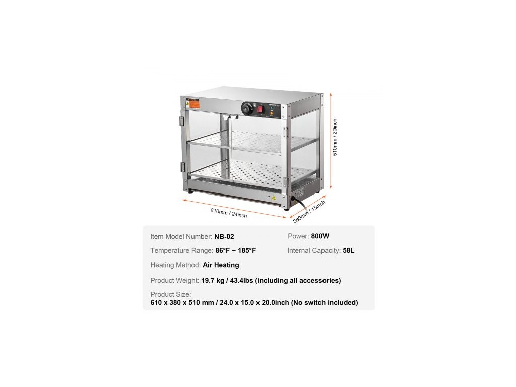 Vnitřní objem: 58L, Číslo modelu položky: NB-02, Hmotnost výrobku: 43,4 lbs / 19,7 kg, Teplotní rozsah: 30℃~85℃, Způsob ohřevu: Ohřev vzduchu, Výkon: 800W, Rozměry výrobku: 24 x 14,96 x 20,08 palce / 610 x 380 x 510 mm (bez vypínače)