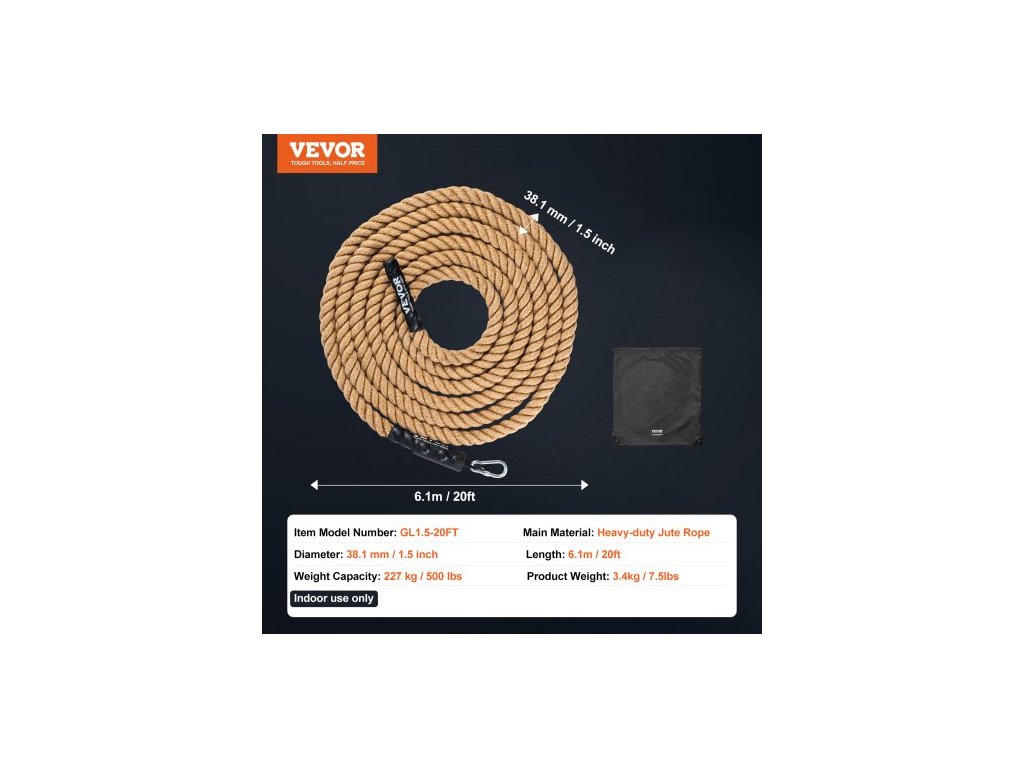 Nosnost: 227 kg / 500 lbs,Délka: 6,1 m / 20 ft,Počet pramenů: 3,Číslo modelu položky: GL1,5-20FT,Hmotnost výrobku: 3,4 kg / 7,5 lbs,Hlavní materiál: Odolné jutové lano,Průměr: 38,1 mm / 1,5 palce