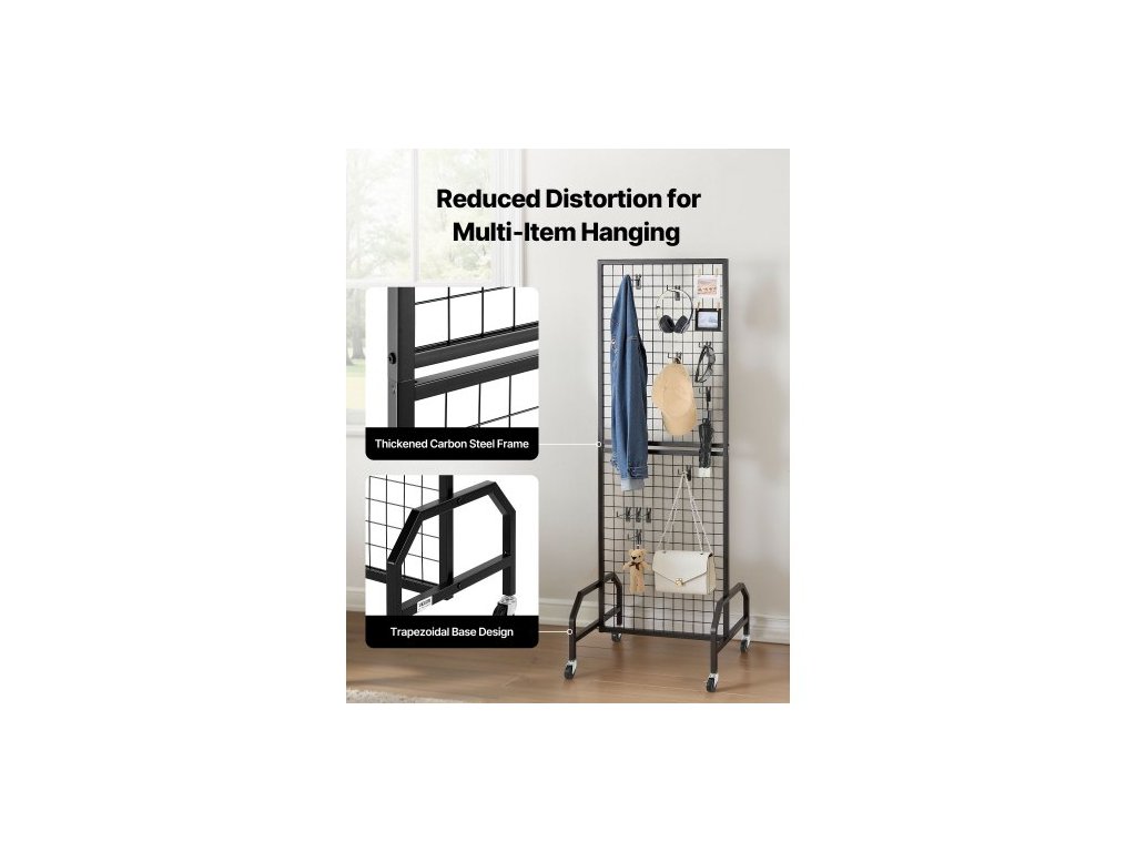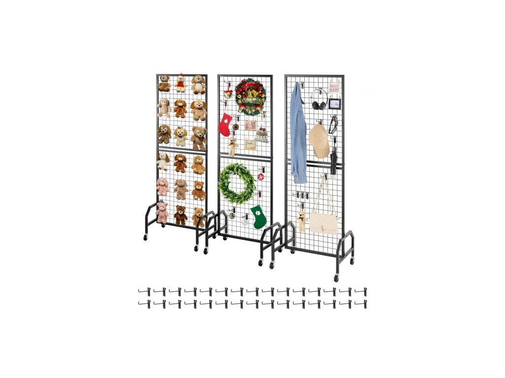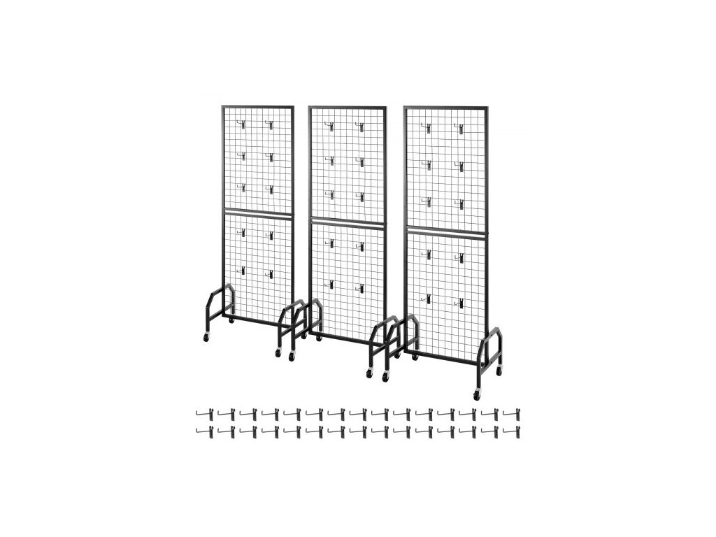 3 balení mřížkových nástěnných panelů, drátěný mřížkový stojan 600 x 1640 mm, pohyblivá police na umění s kolečky a 30 háčky, černá mřížková stěna z uhlíkové oceli pro řemeslné výstavy, dekorace, úložný prostor, nástěnky30 háčků na předměty