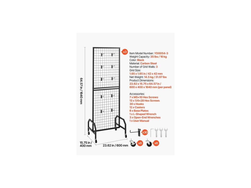Počet mřížkových stěn: 3,Nosnost: 16 kg,Rozměry mřížky: 42 x 42 mm,Barva: Černá,Číslo modelu položky: YD0054-3,Počet mřížkových panelů: 6 ks,Materiál: Uhlíková ocel,Rozměry výrobku: 600 x 400 x 1640 mm (na panel), Čistá hmotnost: 14,5 kg / 31,97 lbs