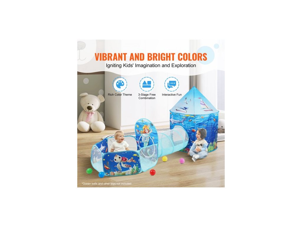 Počet montážních dílů: 3 ks, Vhodné pro věk: 3 - 6 let, Hlavní materiály: Měkká polyesterová tkanina + silný ocelový drát, Model: YM-05, Rozměry míčového hřiště: 39,4x39,4x30,7''/1000x1000x780 mm, Rozměry tunelu: φ18,1x38,2''/φ460x970 mm, Čistá hmotnost: 3,2 libry/1,45 kg, Rozměry trojúhelníkového stanu: φ39,4x50''/φ1000x1270 mm