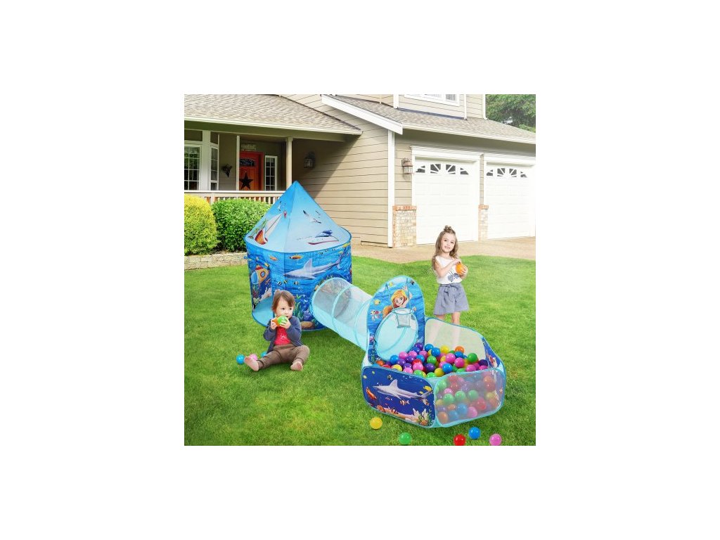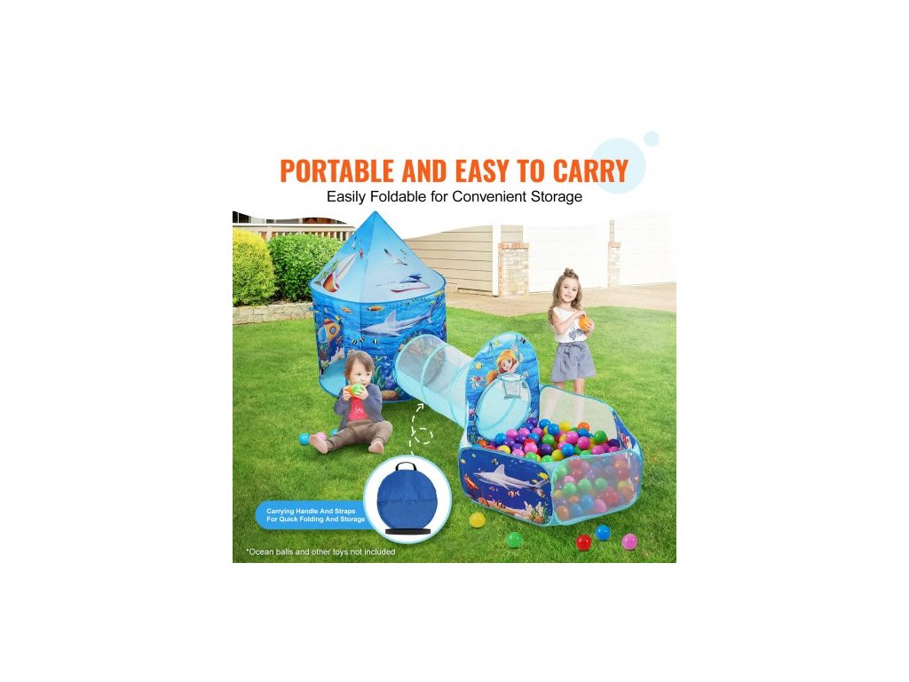 3 v 1 dětský hrací stan s tunelem, basketbalovým košem pro chlapce, dívky, miminka a batolata, vnitřní/venkovní vyskakovací domeček s přepravní taškou a popruhy, dárky k narozeninám, modrý oceán