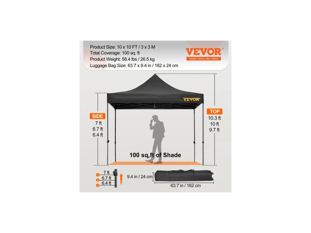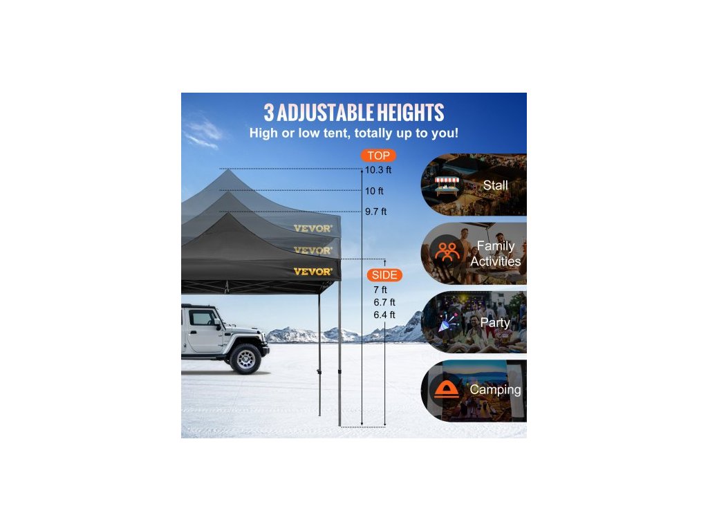 Vrchní materiál: 240g polyester s PVC povlakem,Materiál tašky: 600D Oxfordská tkanina,Barva výrobku: Černá,Nastavitelná boční výška: 6,4 stopy/ 6,7 stop/ 7 stop,Materiál bočních stěn: PVC,Nastavitelná výška vrcholu: 9,7 stop/ 10,0 stop/ 10,3 stopy,Rozměry tašky: 63,7 x 9,4 palce/162 x 24 cm,Hmotnost výrobku: 58,4 lbs/ 26,5 kg, Rozměry stanu: 10 x 10 stop / 3 x 3 m