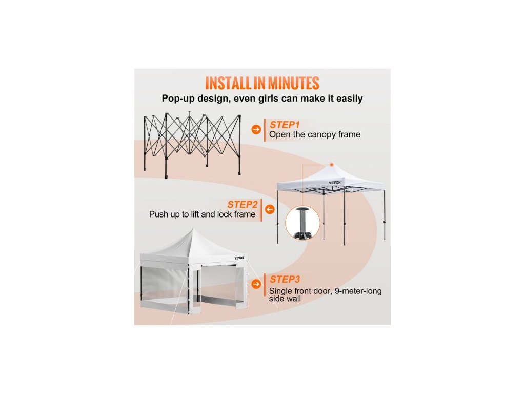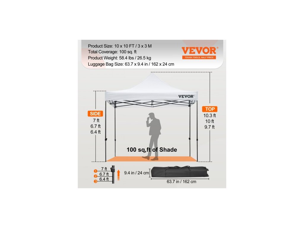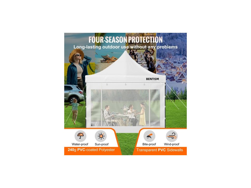 Materiál vrchní části: 240g polyester s PVC povlakem,Materiál tašky: 600D Oxfordská tkanina,Barva výrobku: Bílá,Nastavitelná výška vrcholu: 9,7 stop / 10,0 stop / 10,3 stop:,Materiál bočních stěn: PVC,Rozměry tašky: 63,7 x 9,4 palce / 162 x 24 cm,Hmotnost výrobku: 58,4 lbs / 26,5 kg,Rozměry stanu: 10 x 10 FT/ 3 x 3 M, Nastavitelná boční výška: 6,4 stopy / 6,7 stopy / 7 stop: