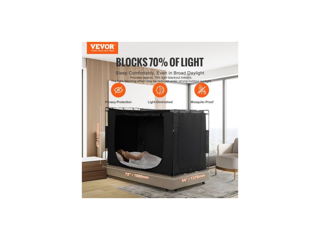 3dveřový stan s lůžkem, prodyšný, 70% zatemnění, s vláknitými tyčemi o tloušťce 0,37 palce, 1900x1370x1190 mmTřídveřový stan pro ochranu soukromí