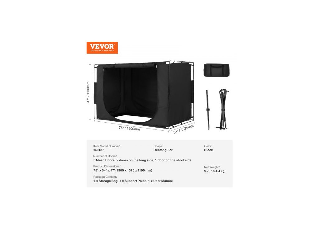 Tvar: Obdélníkový,Barva: Černá,Číslo modelu položky: 140187,Počet dveří: 3 síťované dveře, 2 dveře na delší straně, 1 dveře na krátké straně,Rozměry výrobku: 75" x 54" x 47" (1900 x 1370 x 1190 mm),Čistá hmotnost: 9,7 lbs (4,4 kg)