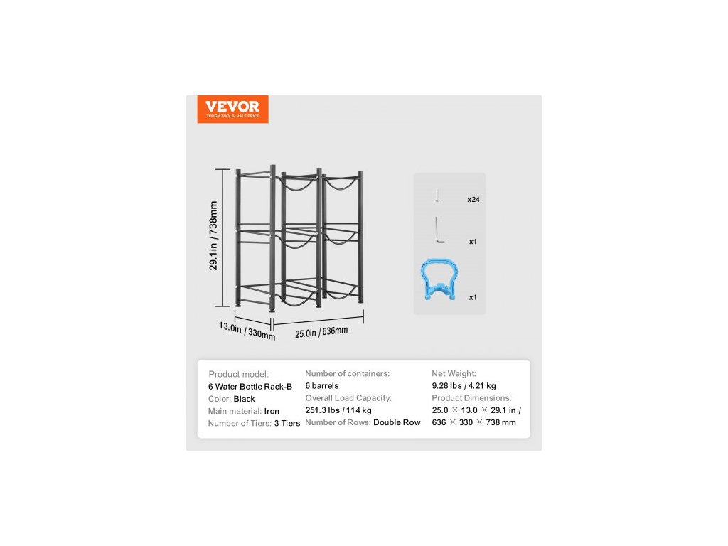 Hlavní materiál: Železo,Počet řad: Dvojitý,Kapacita: 6 lahví,Počet úrovní: 3 úrovně,Barva: Černá,Model produktu: Stojan na 6 lahví na vodu - B,Rozměry produktu: 25,0 × 13,0 × 29,1 palce / 636 × 330 × 738 mm,Čistá hmotnost: 8,60 lbs / 3,90 kg,Celková nosnost: 251,3 lbs / 114 kg