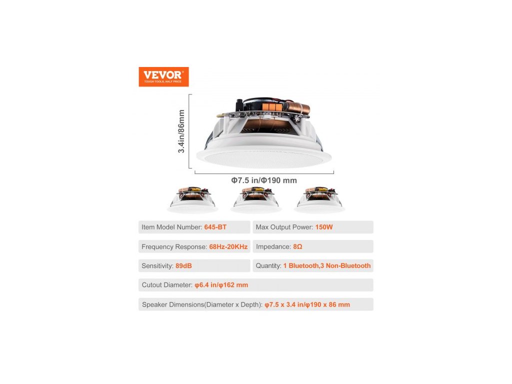 Citlivost: 89 dB,Číslo modelu položky: 645-BT,Množství: 4 ks,Frekvenční odezva: 68 Hz-20 kHz,Impedance: 8 Ω,Rozměry reproduktoru (průměr x hloubka): φ7,5 x 3,4 palce/φ190 x 86 mm,Maximální výstupní výkon: 150 W,Průměr výřezu: 6,4 palce/162 mm