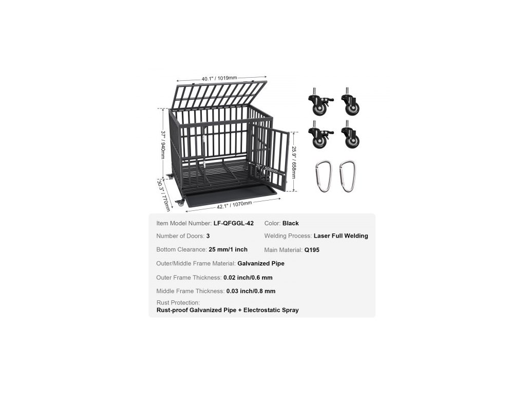 Barva: Černá,Proces svařování: Komplexní laserové svařování,Číslo modelu položky: LF-QFGGL-42,Počet dveří: Tři,Tloušťka středního rámu: 0,03 palce/0,8 mm,Tloušťka vnějšího rámu: 0,02 palce/0,6 mm,Spodní světlá výška: 25 mm/1 palec,Ochrana proti korozi: Nerezová pozinkovaná trubka + elektrostatický nástřik,Hlavní materiál: Q195,Rozměry produktu: 42,1×30,3×37 palců/ 1070 × 770 × 940 mm, materiál vnějšího/středního rámu: pozinkovaná trubka