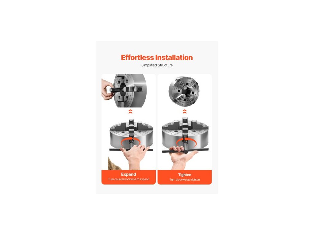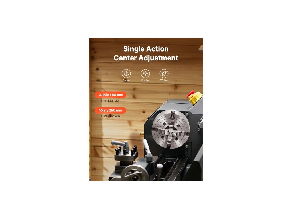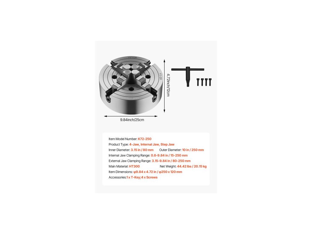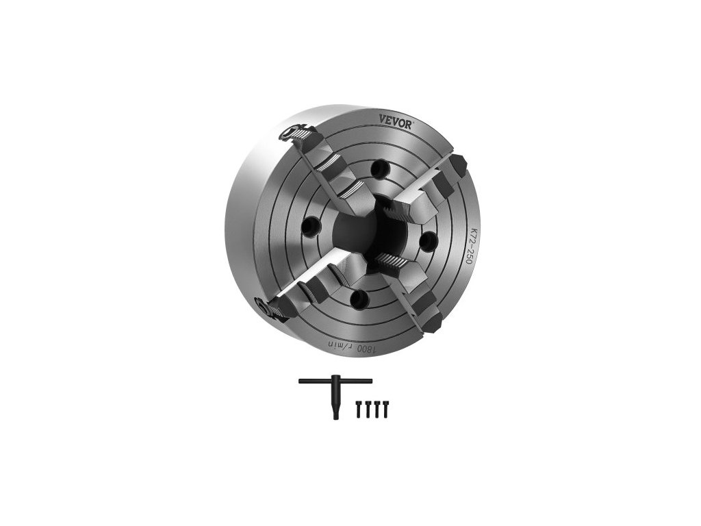 4čelisťové soustružnické sklíčidlo , 250 mm, sklíčidlo, upínací rozsah 15–250 mm s upevňovacími šrouby s T-klíčem, oboustranné čelisti, litina HT300, vnitřní a vnější, pro soustruh na dřevo a kov. Stabilní a spolehlivé. Přesné obrábění. Mnohostranné použití. Široké použití. Vysoká tvrdost. Jednoduchá obsluha. Vnější průměr: 250 mm, Typ produktu: 4čelisťové, vnitřní čelist, stupňovitá čelist, Vnitřní průměr: 80 mm, Číslo modelu položky: K72 250, Rozměry položky: φ9,84 x 4,72 palce / φ250 x 120 mm, Upínací rozsah vnitřní čelisti: 0,6–9,84 palce / 15–250 mm, Rozsah upínání vnější čelisti: 80–250 mm, Čistá hmotnost: 20,15 kg, Hlavní materiál: HT300Doplňkové parametry