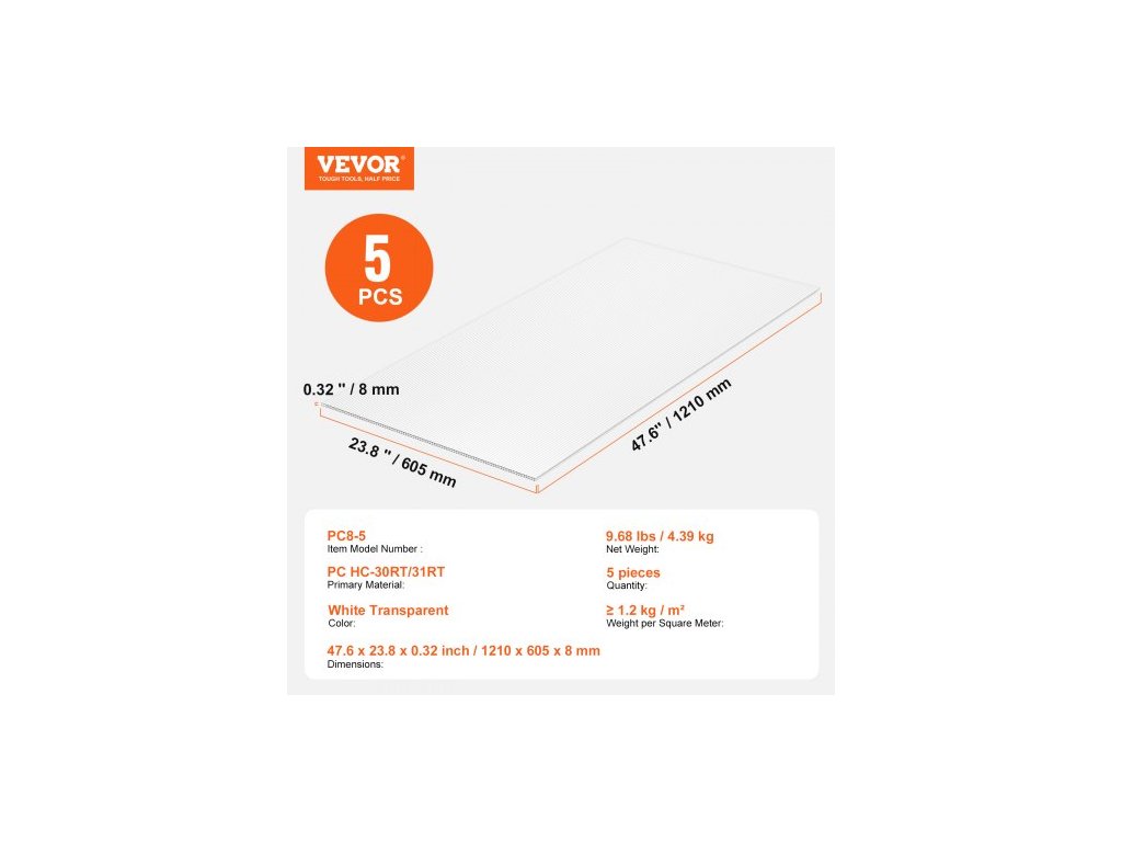 Základní materiál: PC HC-30RT/31RT,Barva: Bílá průhledná,Číslo modelu položky: PC8-5,Hmotnost na metr čtvereční: ≥ 1,2 kg / m²,Rozměry: 47,6 x 23,8 x 0,32 palce / 1210 x 605 x 8 mm,Množství: 5 kusů,Čistá hmotnost: 9,68 lbs / 4,39 kg