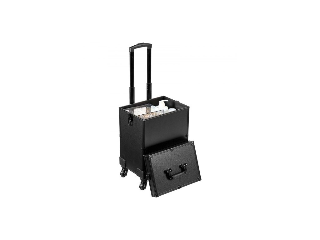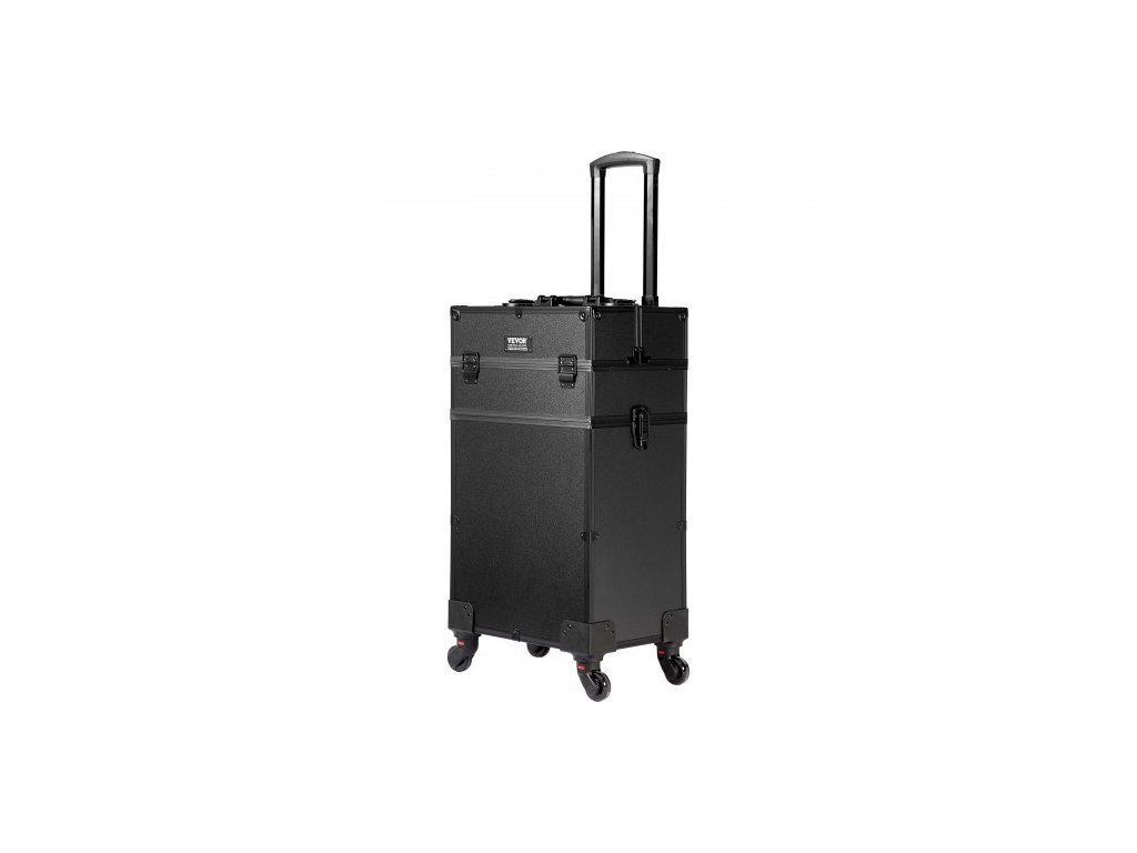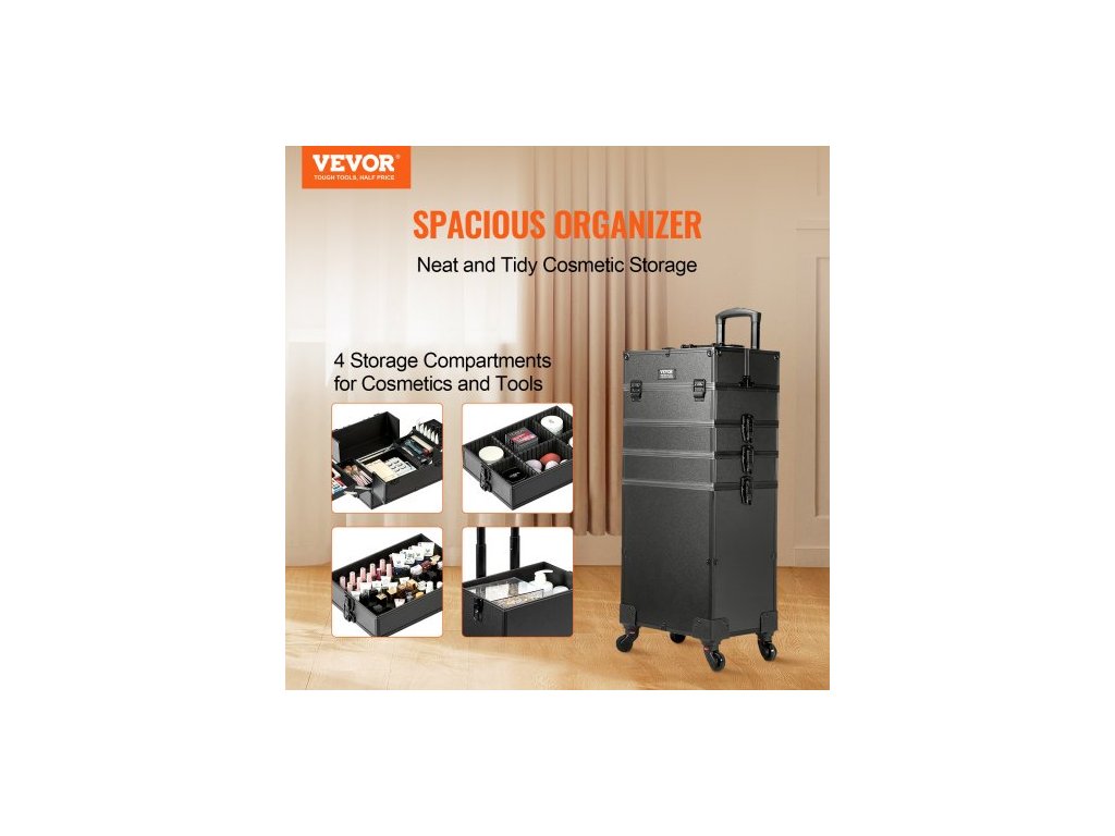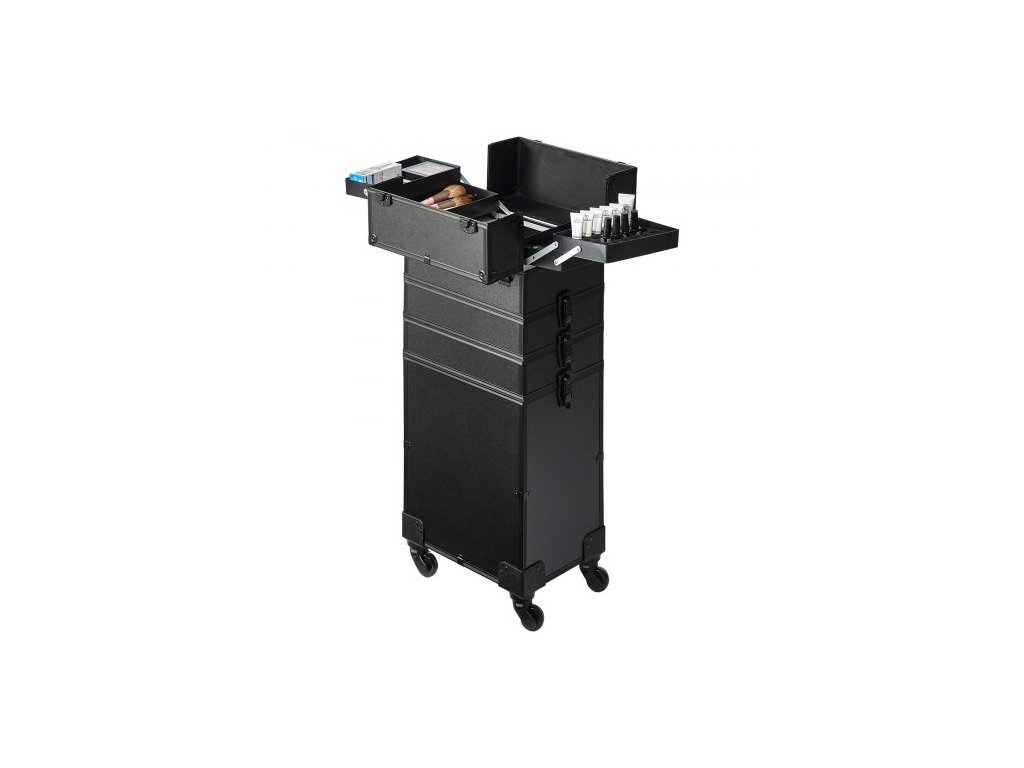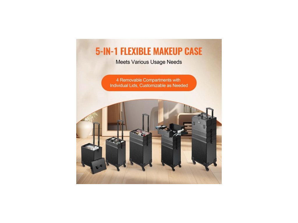 5 v 1 profesionální kosmetický kufřík na make-up, hliníkový kosmetický kufřík, extra velký kosmetický organizér na kolečkách, s otočnými kolečky o 360° a nastavitelnou tažnou tyčí, černýVelká úložná kapacita