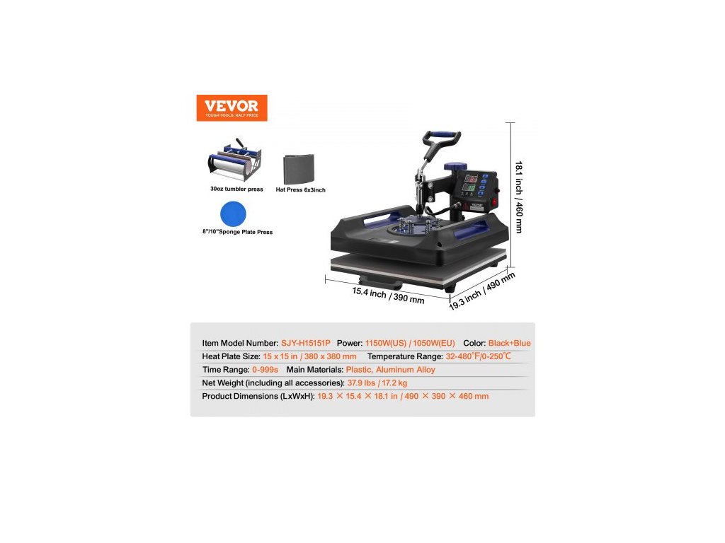 Rozměry topné desky: 15 x 15 palců / 380 x 380 mm,Hlavní materiály: Plast, hliníková slitina,Čistá hmotnost (včetně veškerého příslušenství): 37,9 lbs / 17,2 kg,Časový rozsah: 0-999 s,Barva: Černá + modrá,Číslo modelu položky: SJY-H15151P,Teplotní rozsah: 32-480℉/0-250℃,Příkon: 1150 W (USA) / 1050 W (EU)