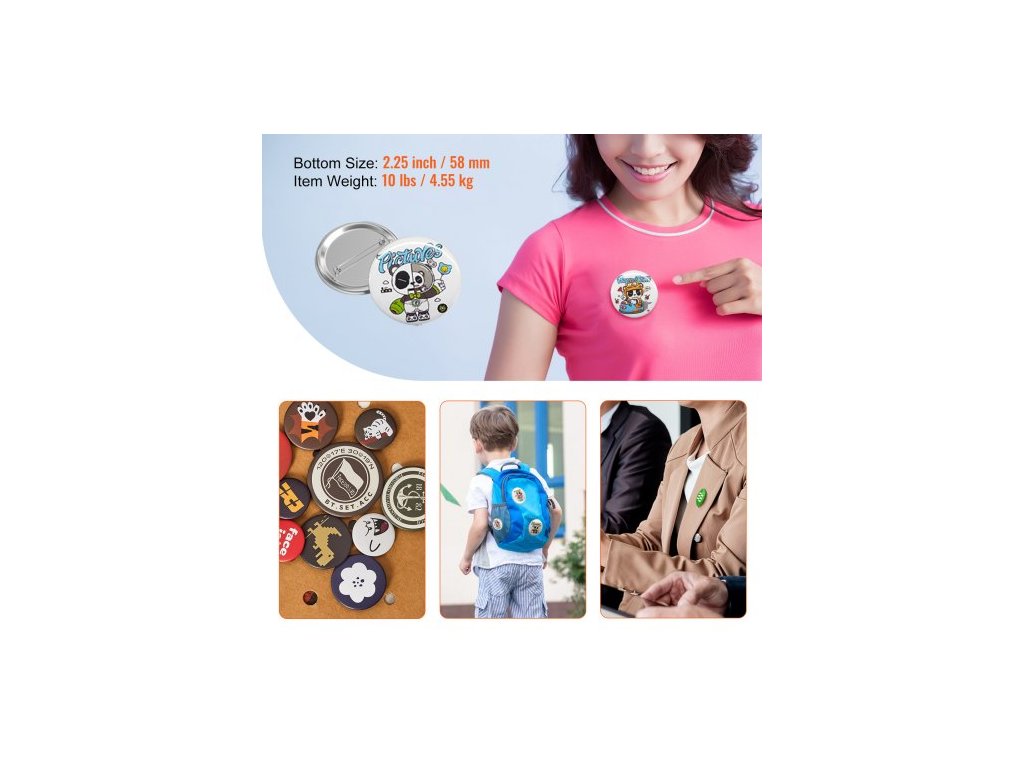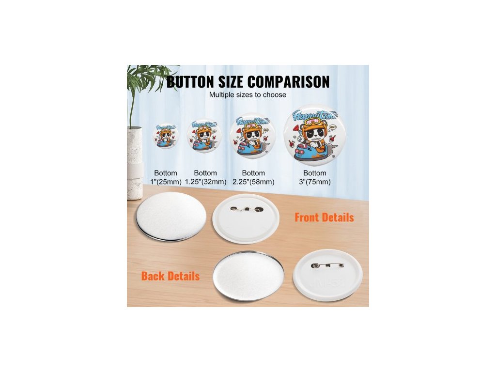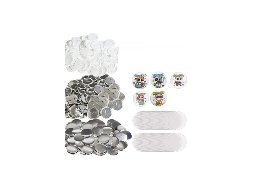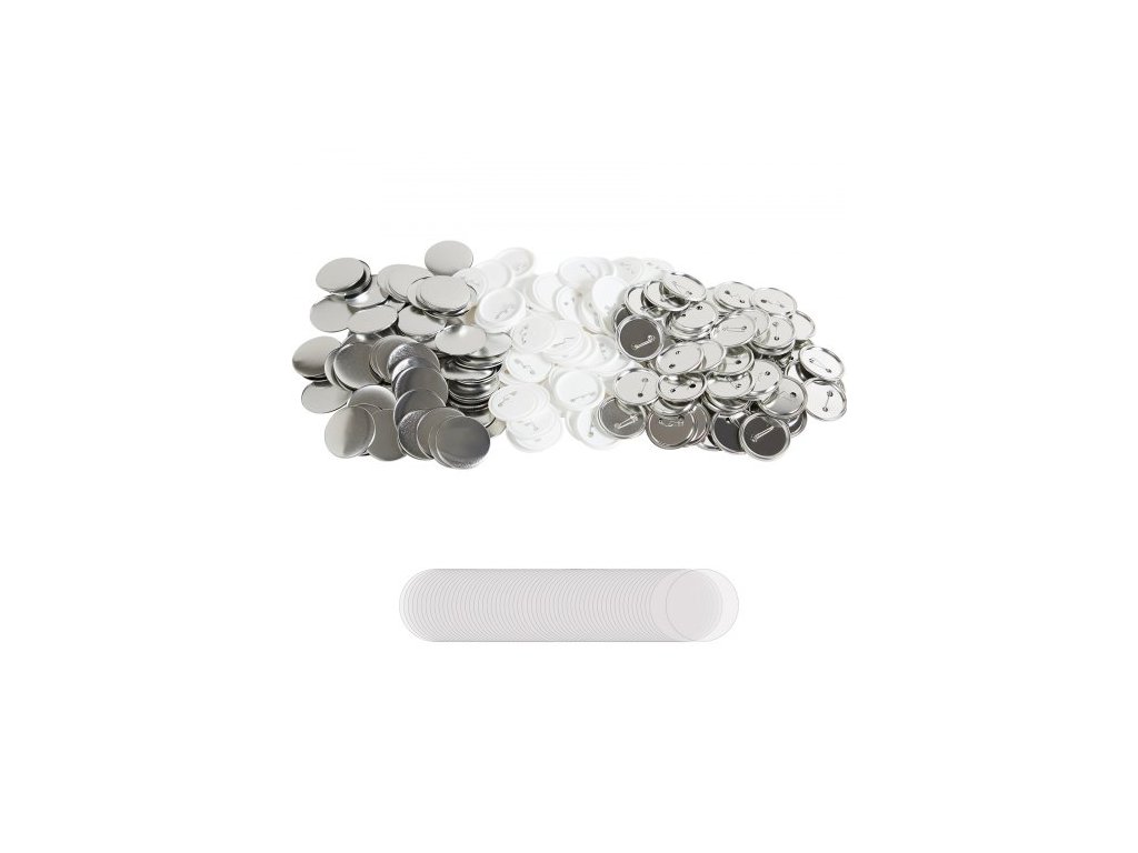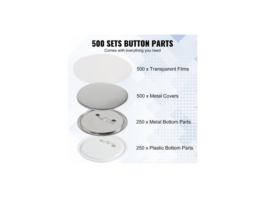 500 sad 2,25 palce 58 mm dílů pro zadní knoflíky, díly pro kutily na kulaté knoflíky, sada obsahuje kovový vršek, plastový/kovový knoflík, průhlednou fólii a prázdný papír na dárky, stroj NENÍ součástí dodávky500 kompletních sad