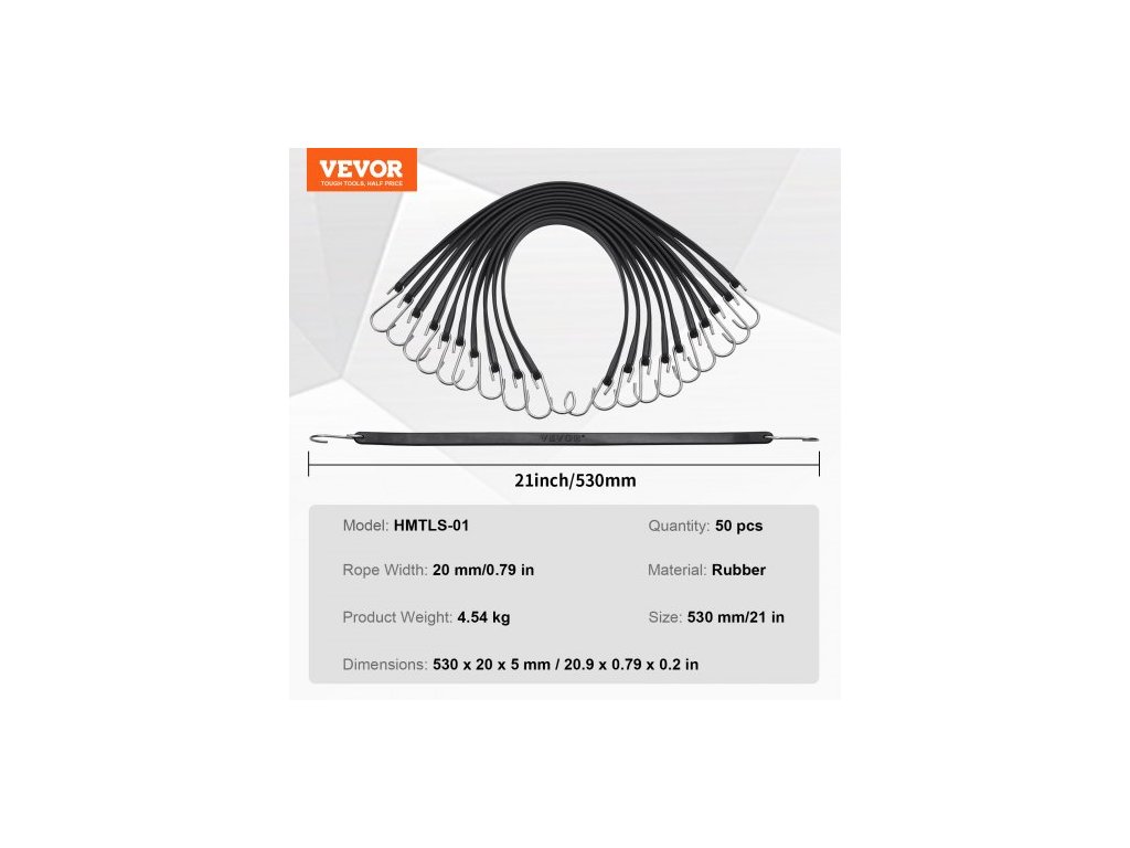 Typ háčku: S-háček,Množství: 50 ks,Materiál: Guma,Rozměry výrobku: 53 x 2 x 0,5 cm,Šířka háčku: 25 mm,Maximální zatížení: 300 N,Materiál háčku: Ocel,Průměr háčku: 4 mm,Model: HMTLS-01,Povrchová úprava: Hladká,Hmotnost výrobku: 4,54 kg,Kulatý průměr / plochá šířka: 31,5 cm (1,6x),Délky: 21 ±1 in / 0,53 m