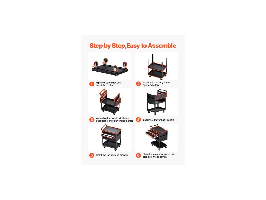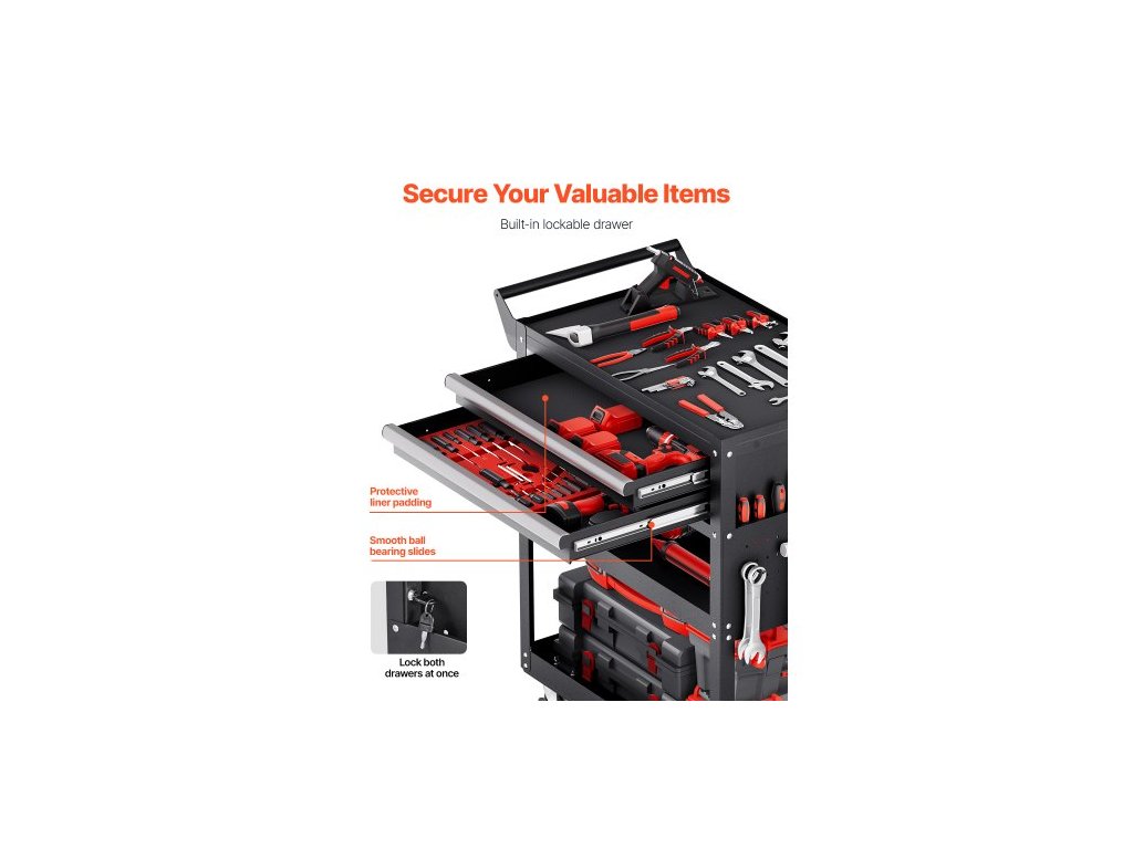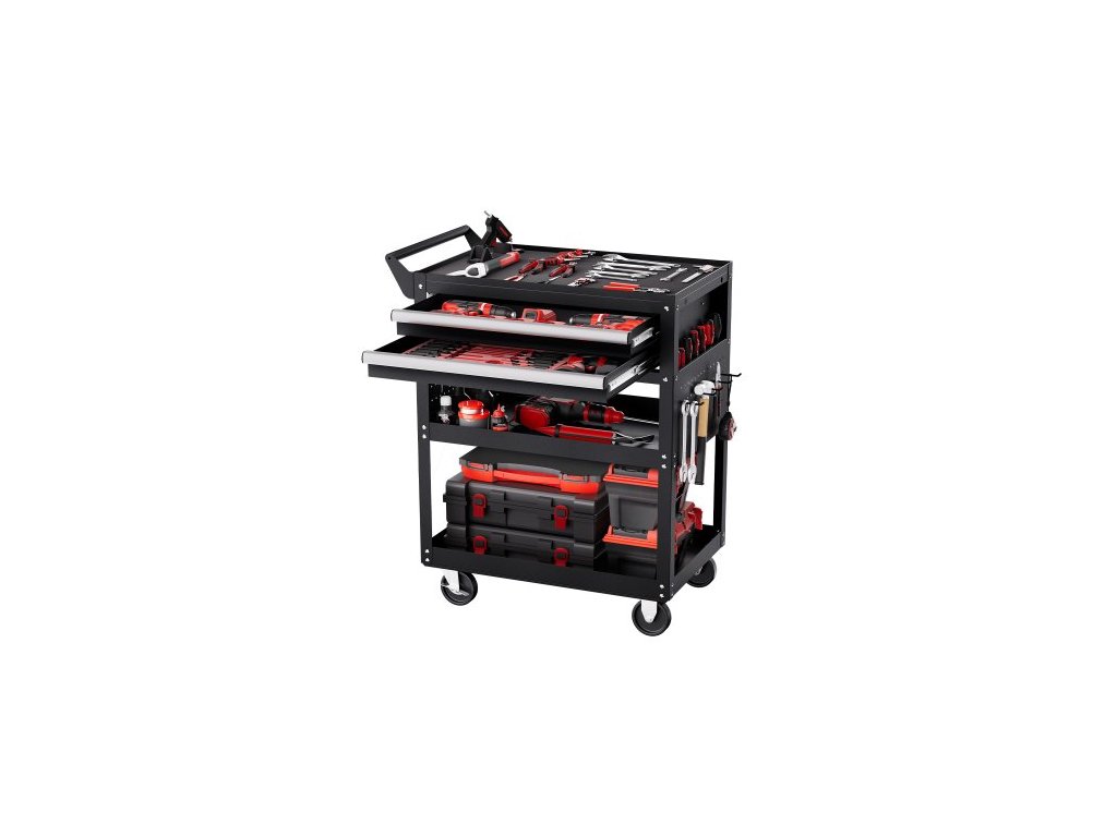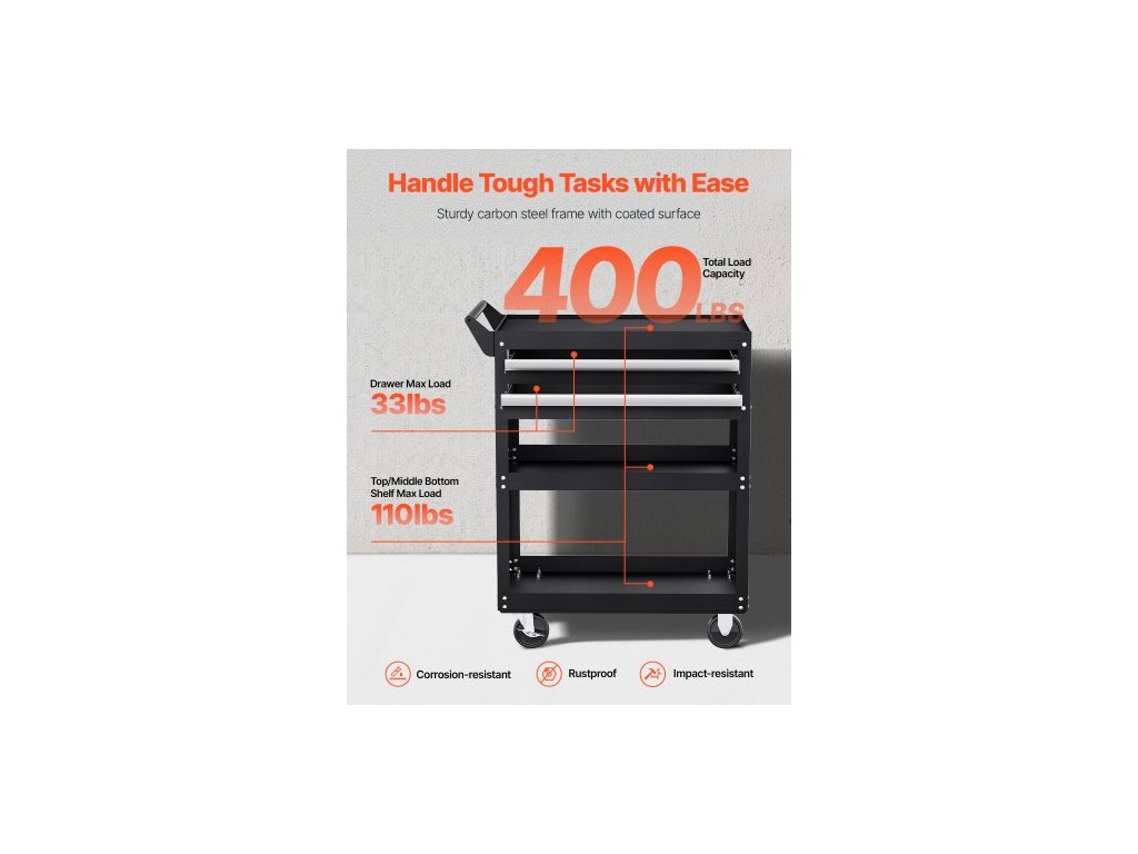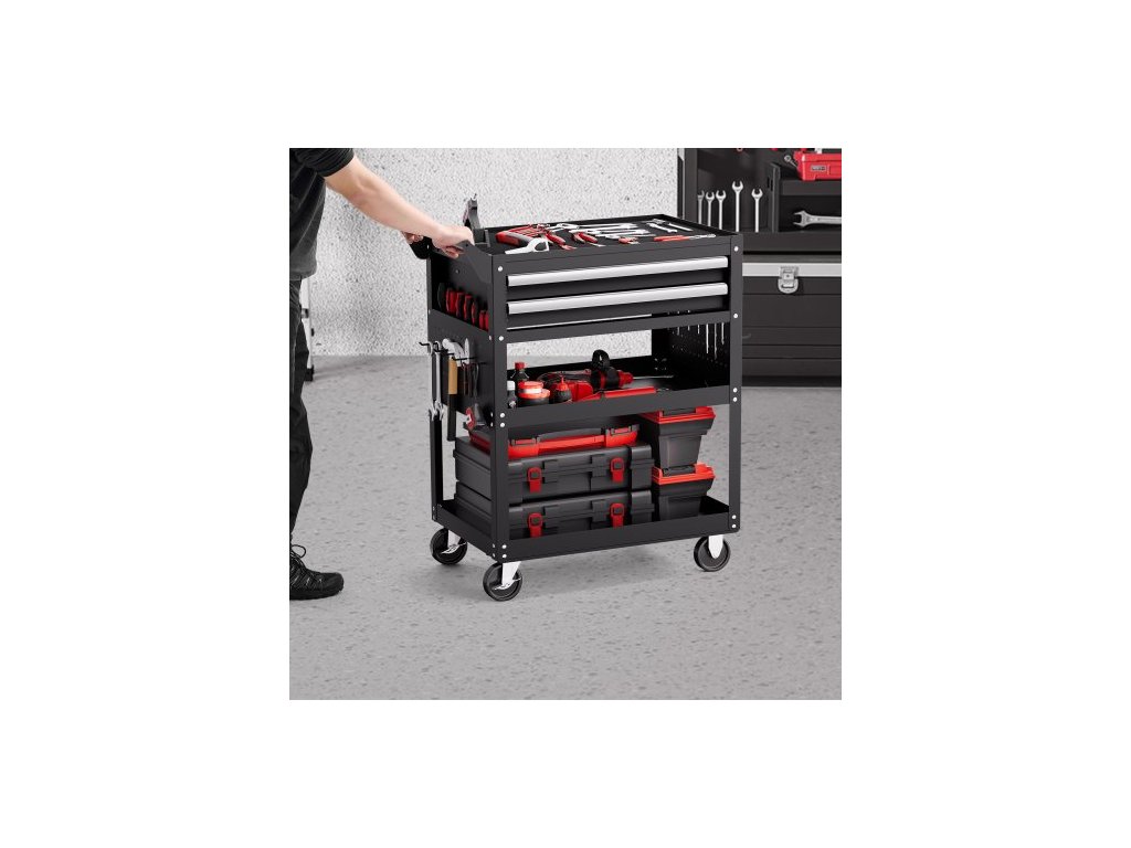 Rozměry děrované desky: 440 x 245 mm,Rozměry zásuvky: 597 x 403 x 62 mm,Barva: Černá,Celková nosnost: 181,4 kg,Nosnost na polici: 49,9 kg,Počet koleček: 4 otočná kolečka (2 s brzdami),Rozměry korpusu: 28 x 18 x 36 palců / 700 x 450 x 909 mm,Nosnost zásuvky: 33 lbs / 15 kg,Počet úrovní: 3 přihrádky + 2 zásuvky,① 6,6 palců / 167 mm (od dna zásuvky k prostřednímu okraji police):,Celková velikost výrobku: 30,9 x 17,7 x 37,2 palců / 785 x 450 x 945 mm (včetně koleček a rukojeti),Číslo modelu položky: T271802,Hmotnost výrobku: 50,57 lbs / 22,94 kg,Rozměry horního přihrádky: 27,4 x 17,6 x 0,8 palců / 697 x 447 x 20 mm,Výška rozteče polic:,② 11,5 palců / 292 mm (od dna prostřední police k dolnímu okraji police):,Rozměry prostředního a spodního přihrádky: 27,4 x 17,6 x 2 palce / 697 x 447 x 50 mm