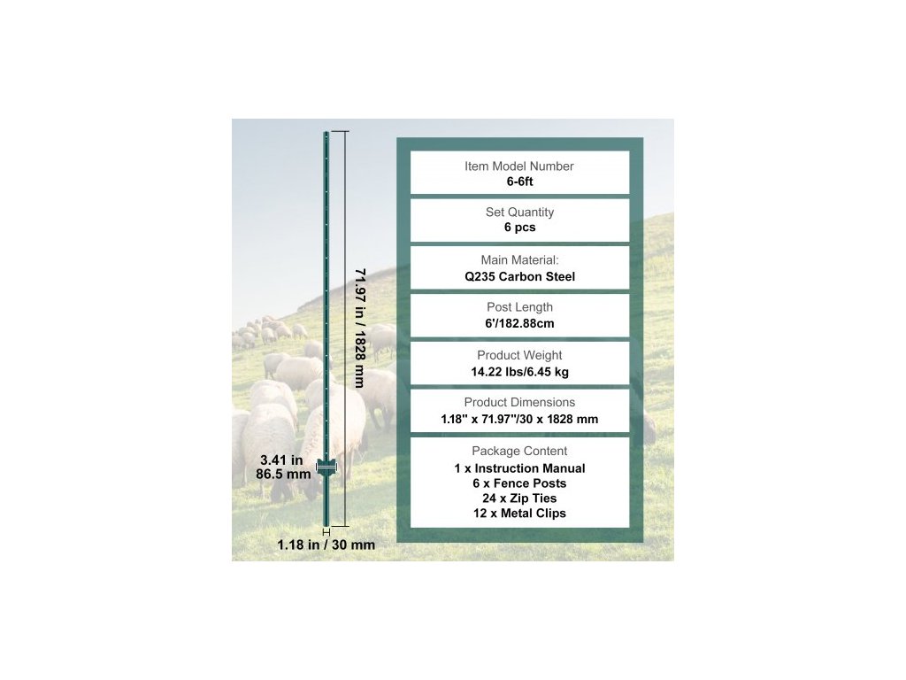 Množství v sadě: 6 ks,Délka sloupku: 6' / 182,88 cm,Číslo modelu položky: 6-6 stop,Hmotnost výrobku: 14,22 lbs / 6,45 kg,Rozměry výrobku: 3,41" x 0,59" x 71,97" / 86,5 x 15 x 1828 mm,Hlavní materiál: Uhlíková ocel Q235