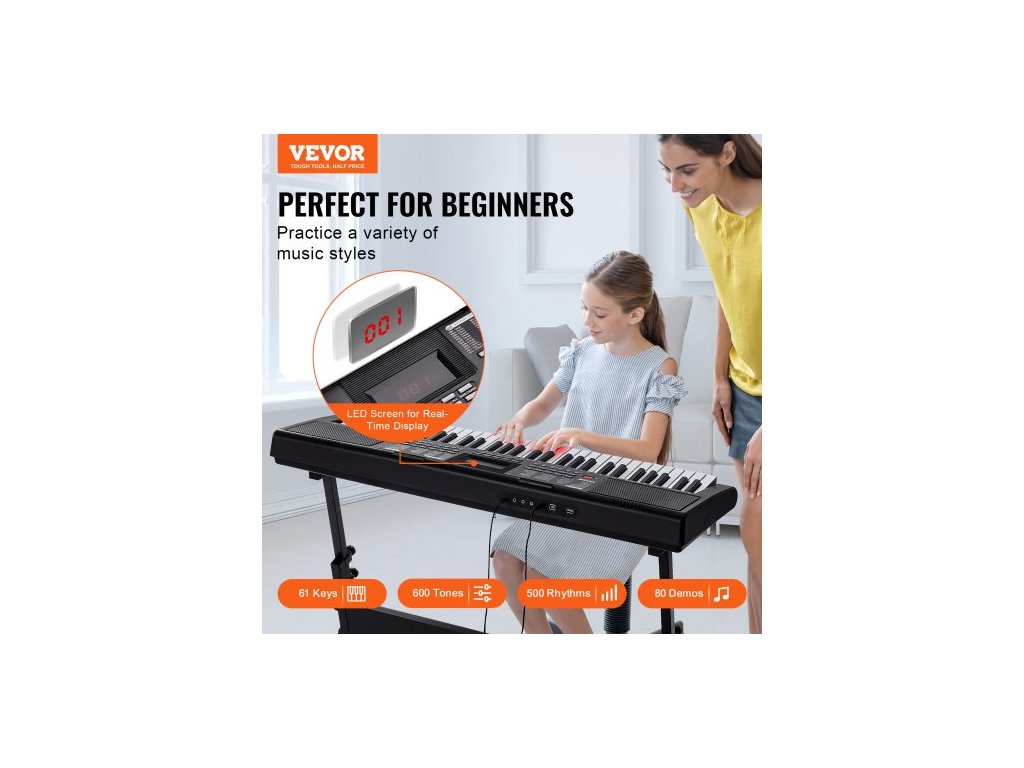 Digitální klávesové piano s 61 klávesami, podsvícené klávesy, elektrické přenosné piano s nastavitelným stojanem, 600 tónů, 500 rytmů, vestavěné reproduktory, sluchátka se sustain pedálem, USB MIDI pro začátečníkyDigitální piano s 61 klávesami