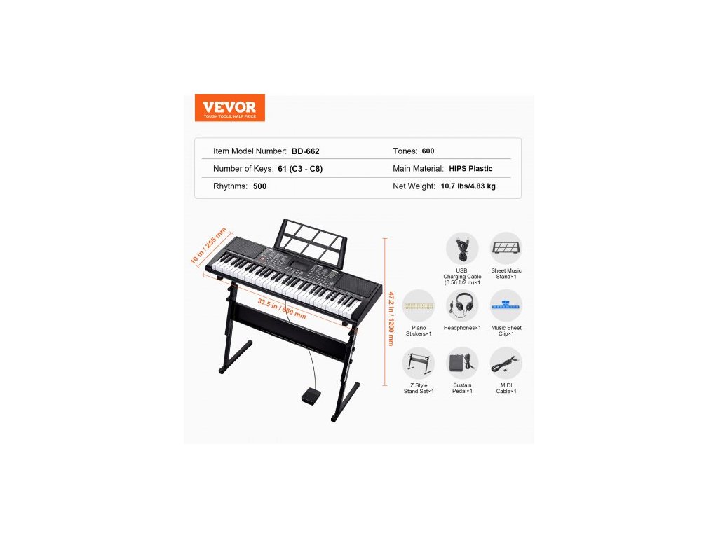 Počet kláves: 61 (C3 - C8), tóny: 600, číslo modelu: BD-662, rytmy: 500, rozměry výrobku: 33,5 x 10 x 47,2 palce/850 x 255 x 1200 mm, hmotnost netto: 10,7 lbs/4,83 kg