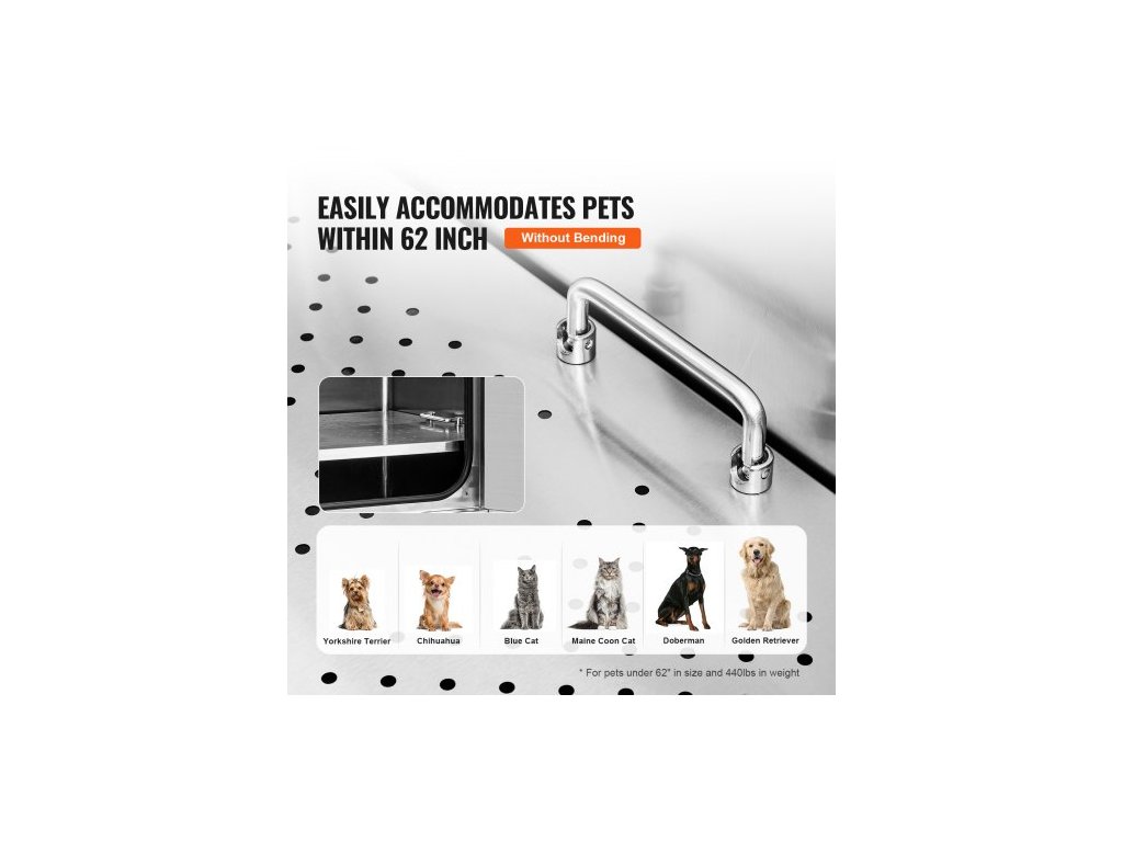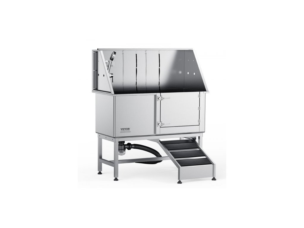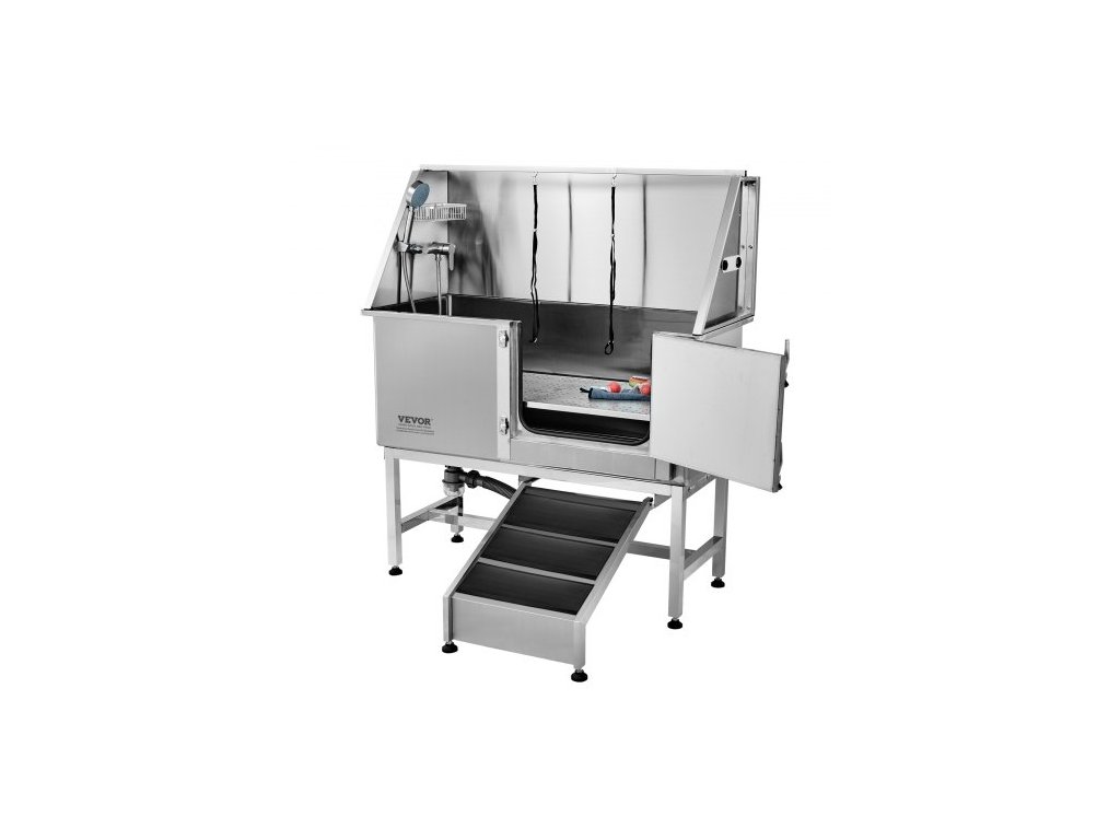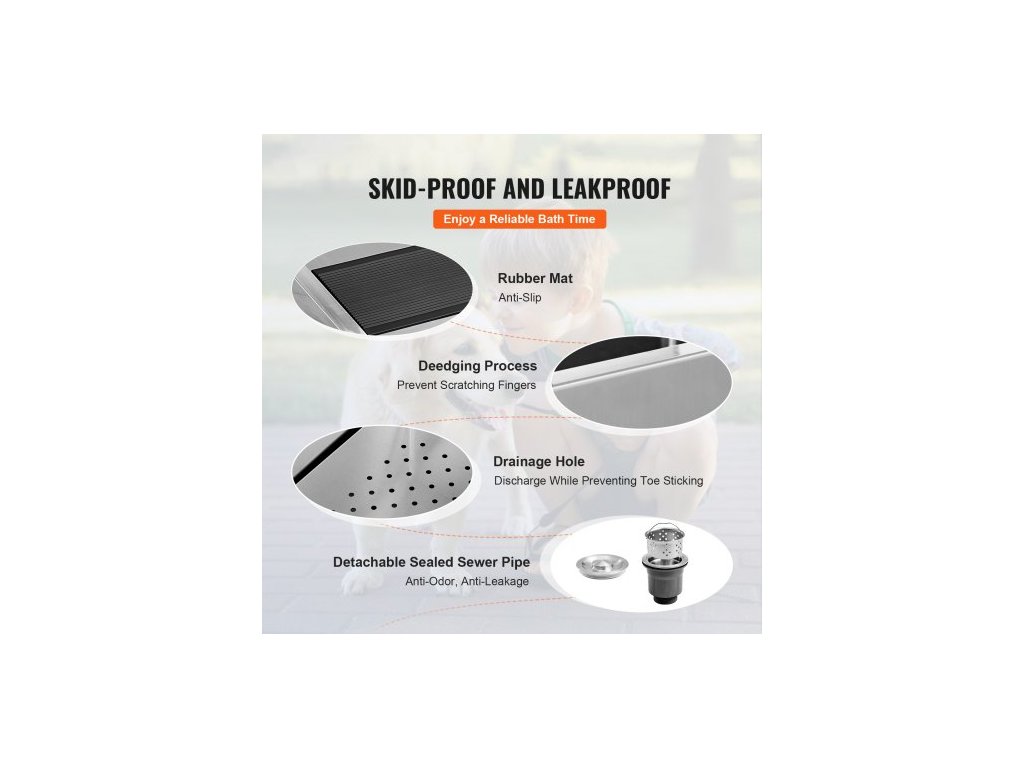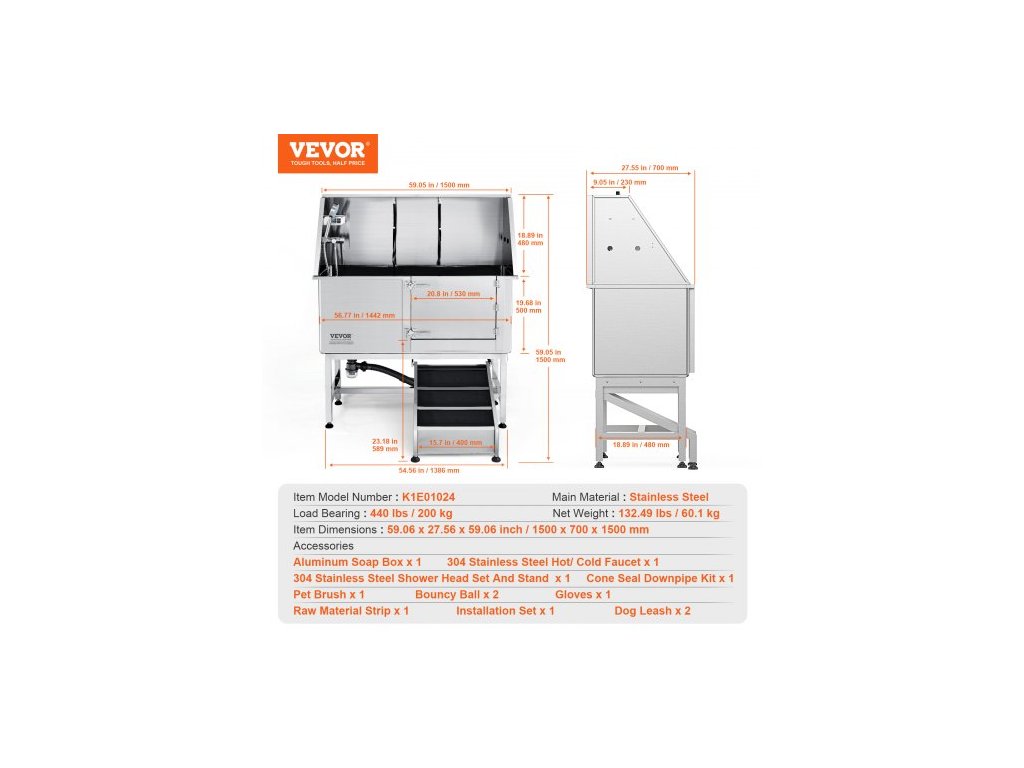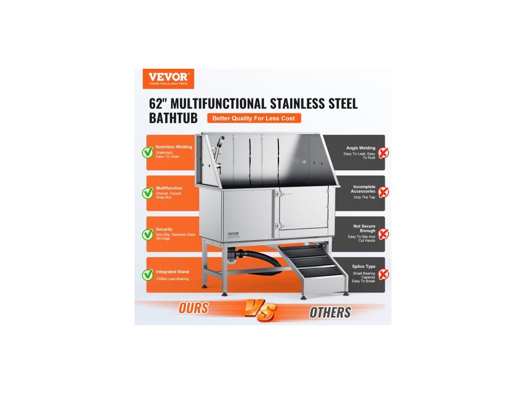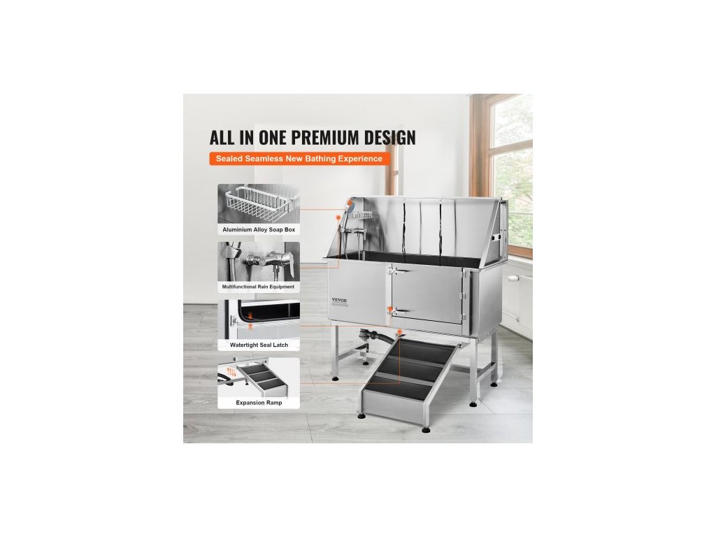 Koupací stanice pro psy 62" s rampou, profesionální nerezová vana na stříhání psů s mýdlovou nádobou, kohoutkem, bohatým příslušenstvím, vana pro velké, střední a malé domácí mazlíčky, mycí dřez pro domácnost (pravý)Vysoká nosnost