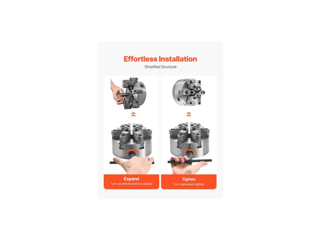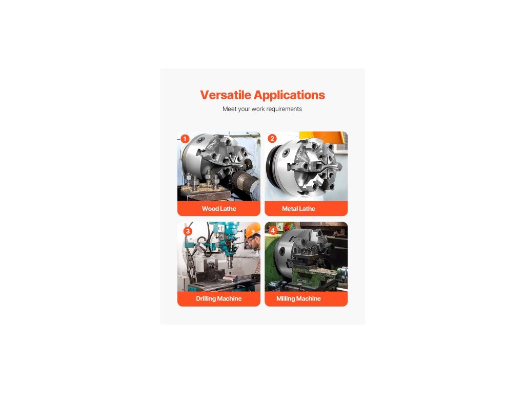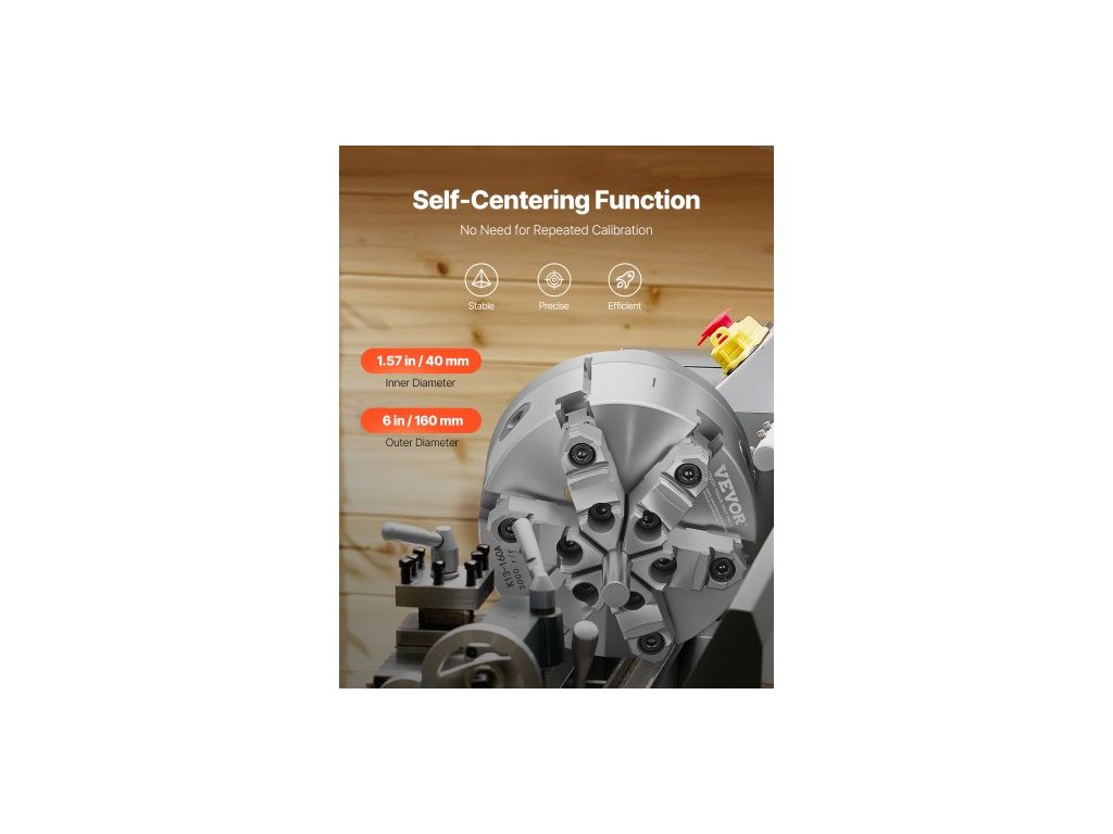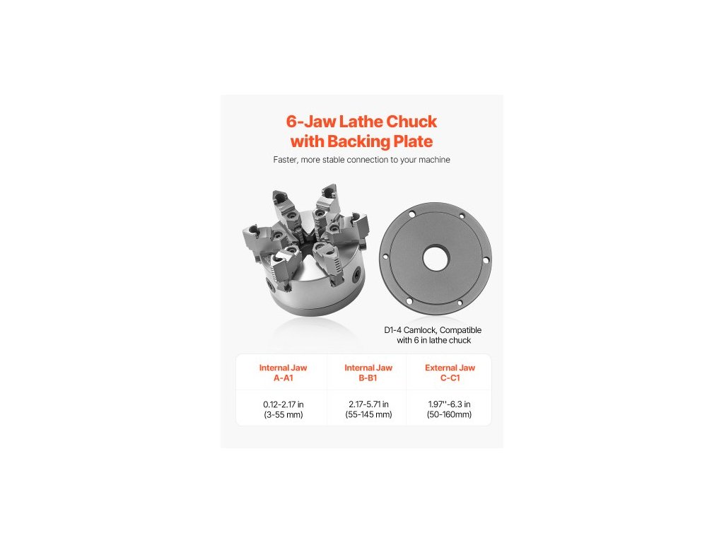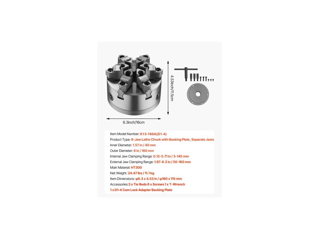 6čelisťové soustružnické sklíčidlo , 6 palců (160 mm), samostředicí sklíčidlo s opěrnou deskou D1-4 s vačkovým zámkem, upínací rozsah 0,12-5,71 palce (3-145 mm) s T-klíčem, materiál HT300, pro soustruh na dřevo a kovStabilní a spolehlivé