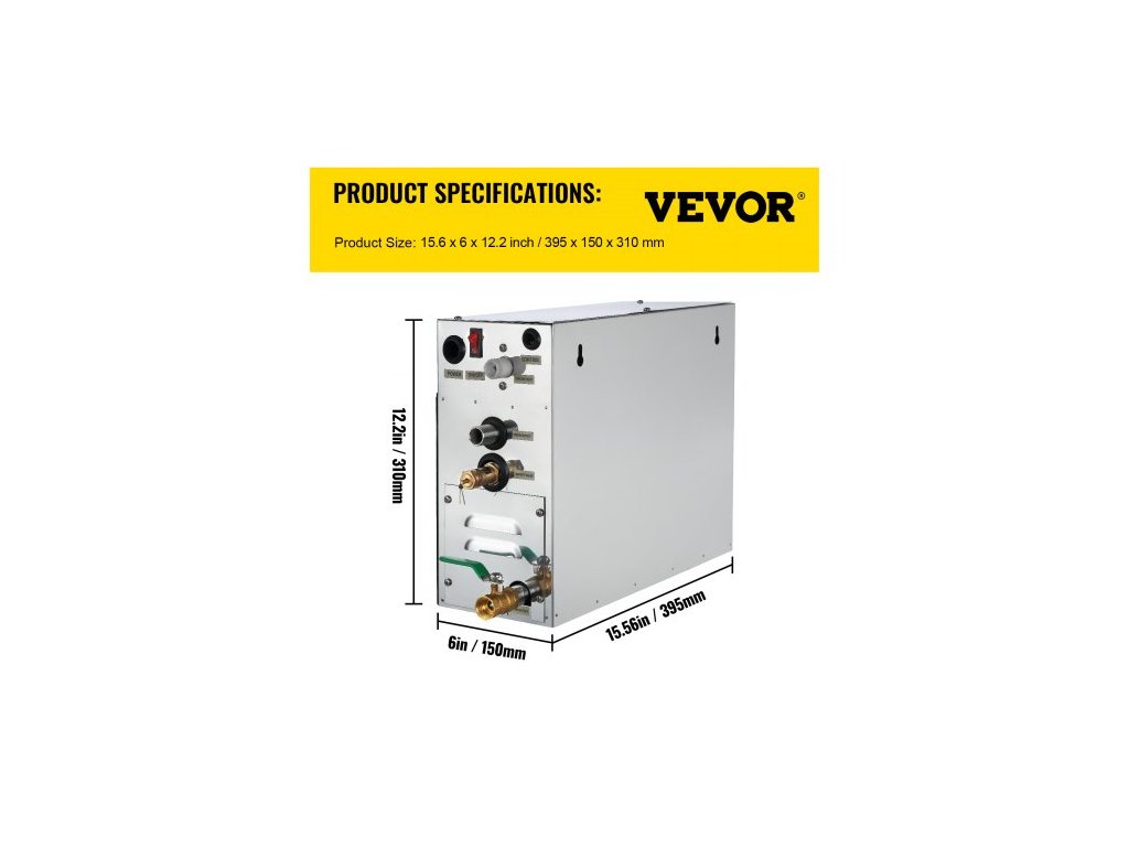 Objem místnosti: 6 m³, Napětí: 220/240 V, Nádrž na vodu: 4,3 l, Model: VV-SG-6KW, Teplotní rozsah: 35–55 °C, Výkon: 6 kW, Rozměry topného tělesa: 39,5 x 15,3 x 31,3 cm, Hmotnost: 10 kg, Rozměry LED monitoru: 9,9 x 3,9" x 2,4" / 10 x 10 x 5 cm