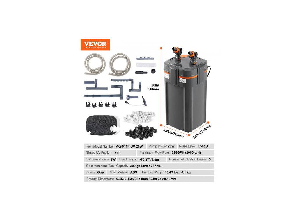 Doporučená kapacita nádrže: 200 galonů / 757,1 l, Výkon čerpadla: 20 W, Barva: Šedá, Maximální průtok: 528 GPH (2000 l/h), Rozměry produktu: 9,45x9,45x17,32 palce / 240x240x440 mm, Výkon UV lampy: 9 W, Počet filtračních vrstev: 5, Hladina hluku: <50 dB, Výška hlavy: >70,87''/1,8 m, Model: AQ-911F-UV 20 W, Hmotnost produktu: 13,45 6,1 kg, Funkce časovaného UV záření: Ano, Hlavní materiál: ABS