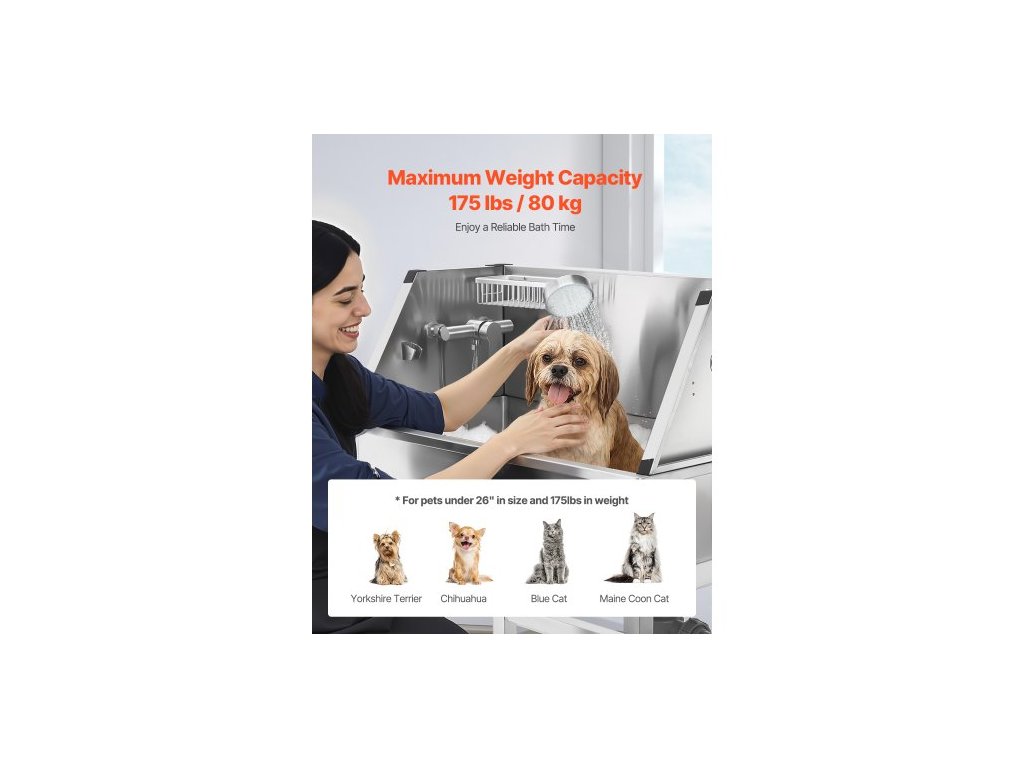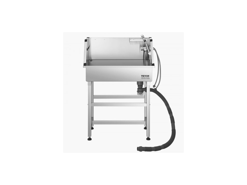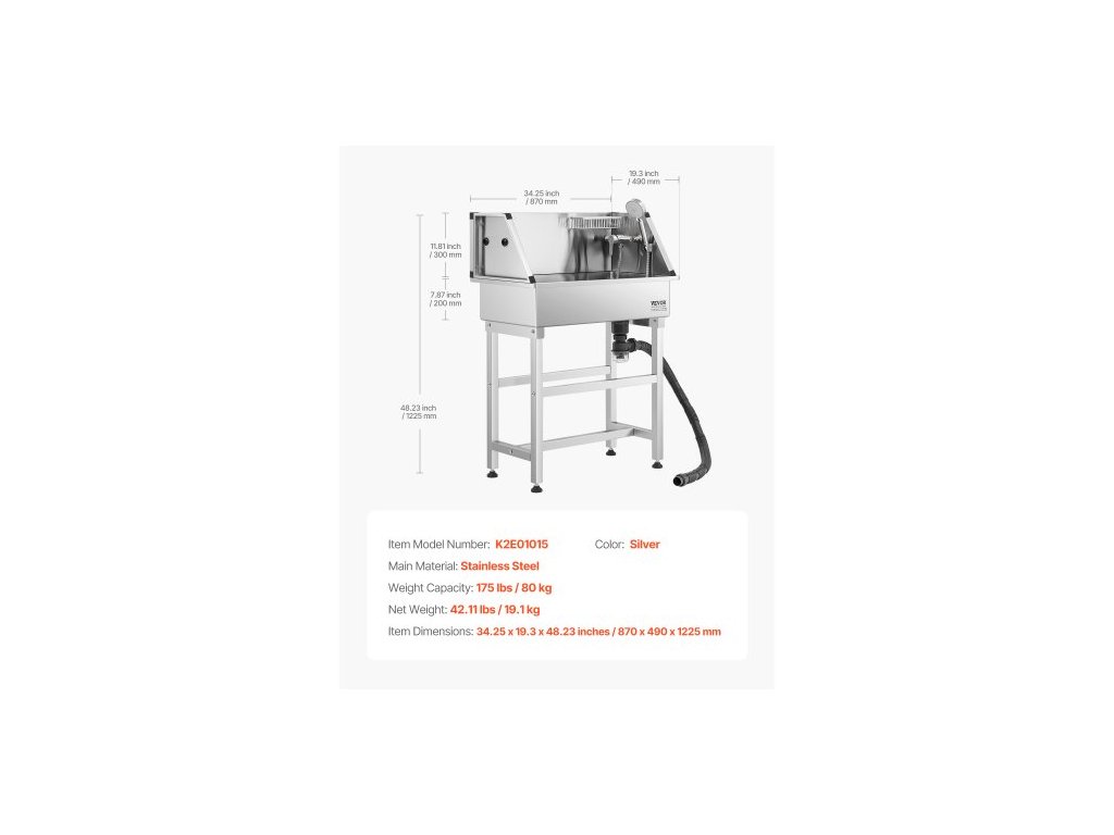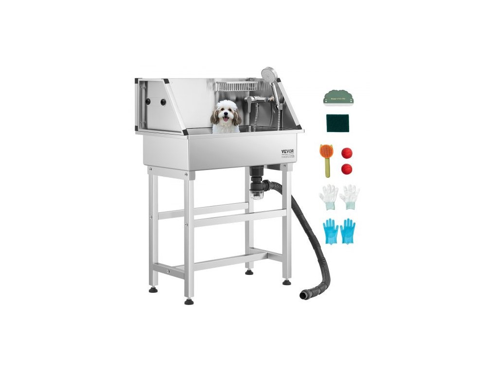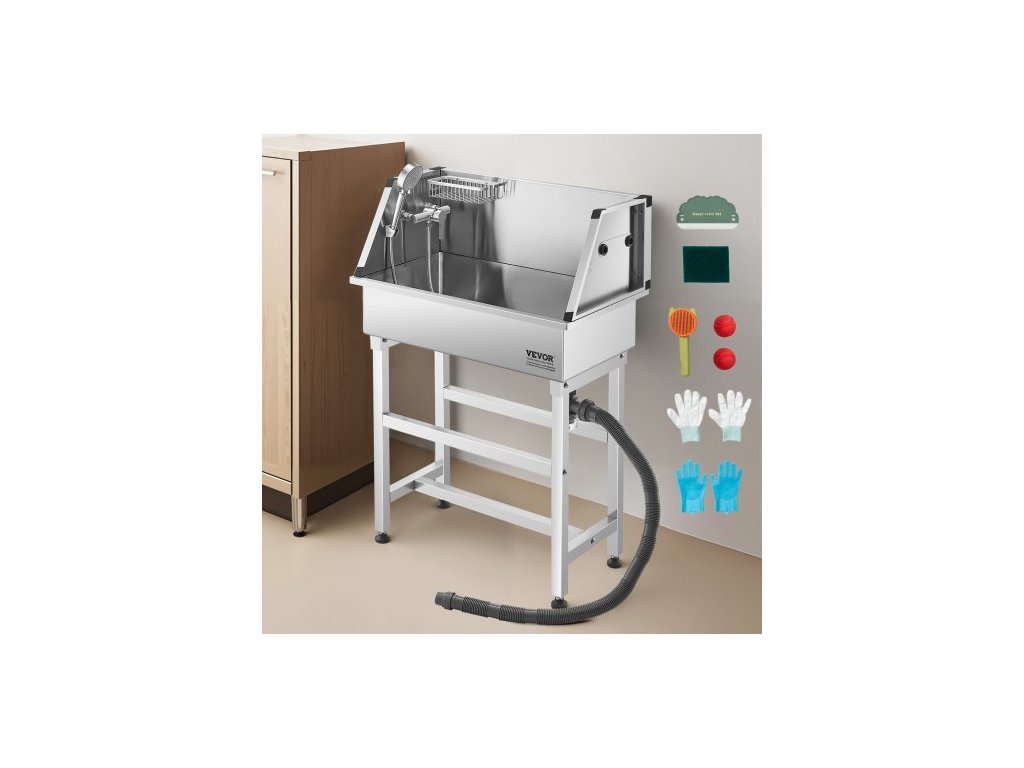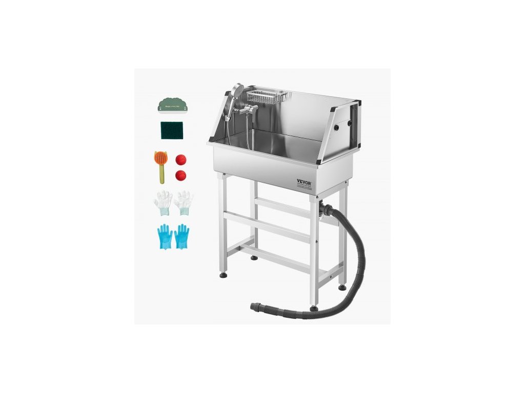 86,4 cm nerezová mycí stanice pro psy, vana na péči o domácí mazlíčky s kohoutkem na teplou a studenou vodu, sprchová hlavice, úložný prostor, neohýbací vana vše v jednom, umyvadlo pro domácí použití, vhodné pro malé kočky a psyNastavitelné nožičky
