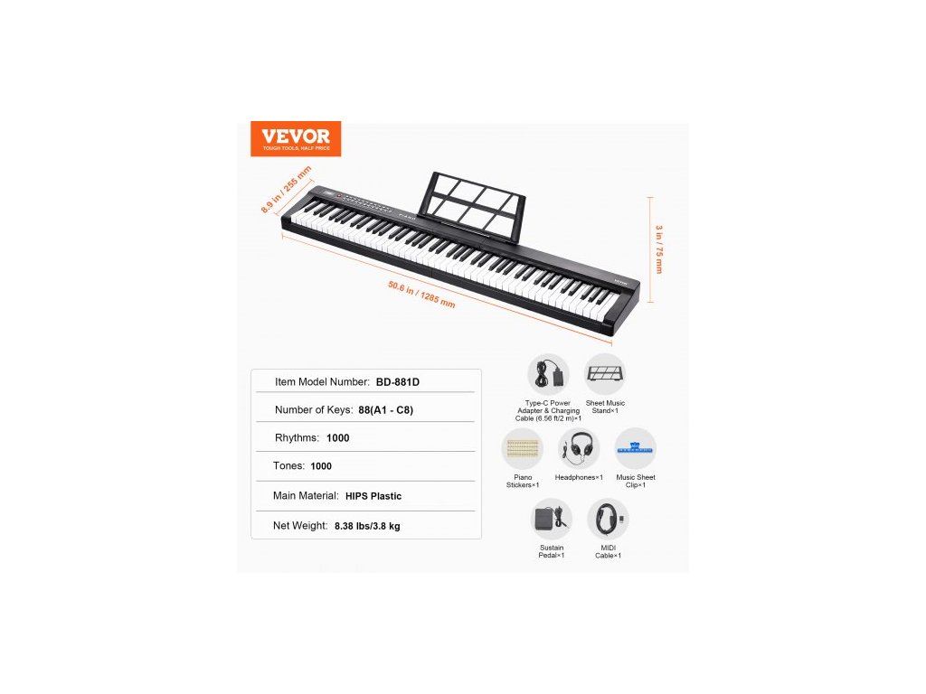 Počet kláves: 88 (A1 - C8), tóny: 1000, číslo modelu: BD-881D, rytmy: 1000, rozměry produktu: 50,6 x 8,9 x 3 palce/1285 x 225 x 75 mm, čistá hmotnost: 8,38 lbs/3,8 kg, hlavní materiál: plast HIPS