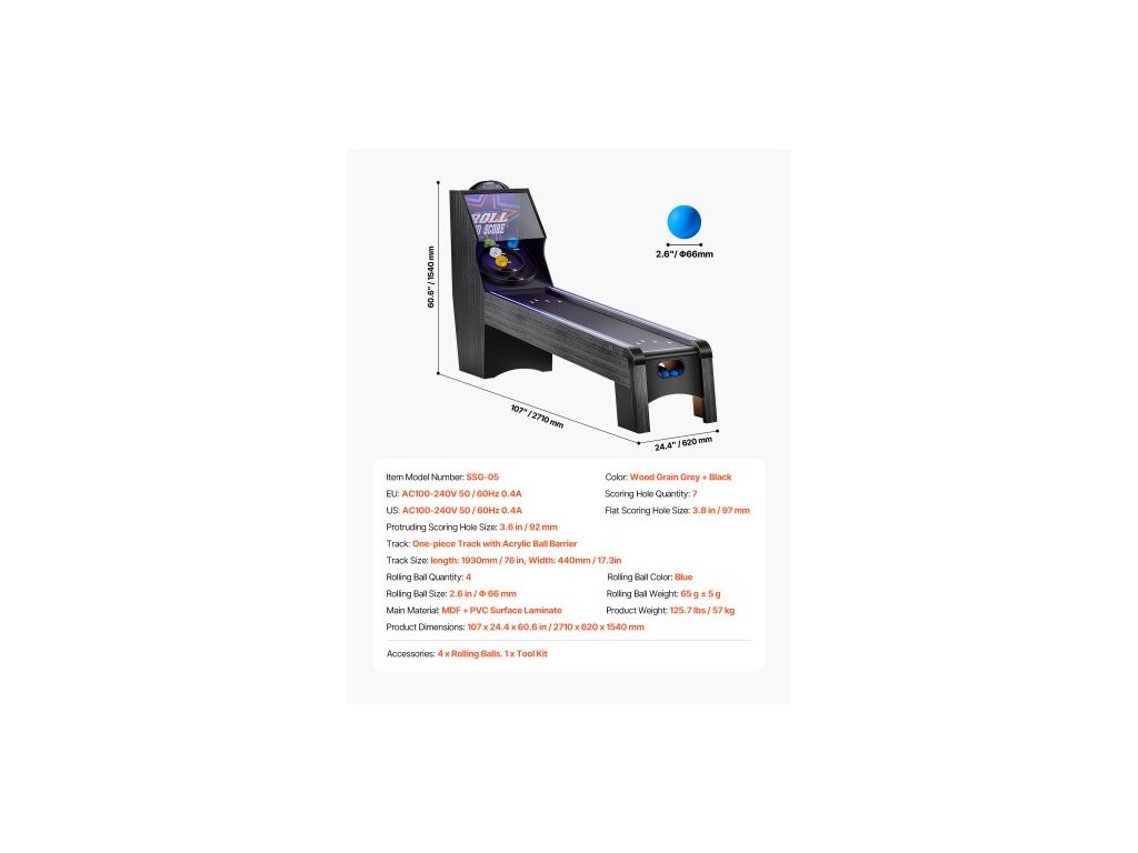 Velikost plochého bodovacího otvoru: 3,8 palce / 97 mm,,Množství koulí: 4,Barva koulí: Modrá,Barva: Šedá + černá s dřevěným vzorem,Číslo modelu položky: SSG-06,Hmotnost výrobku: 125,7 lbs / 57 kg,Velikost vyčnívajícího bodovacího otvoru: 3,6 palce / 92 mm,Hmotnost koule: 65 g ± 5 g,Velikost koule: 2,6 palce / Φ 66 mm,Rozměry výrobku: 107 x 24,4 x 60,6 palce / 2710 x 620 x 1540 mm, Hlavní materiál: MDF + PVC povrchový laminát, Počet otvorů pro drážkování: 7