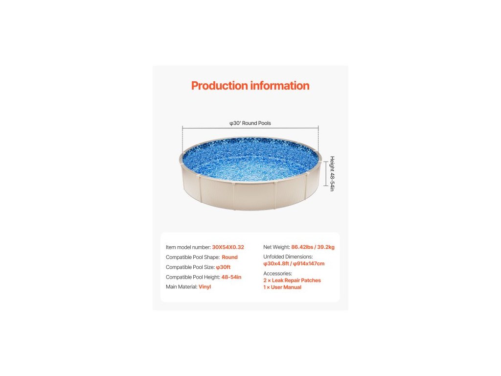 Výška kompatibilního bazénu: ≤136 cm, Rozměry v rozloženém stavu: φ30x4,8 stopy / φ914x147 cm, Číslo modelu položky: 30x54x0,32, Kompatibilní tvar bazénu: Kulatý, Kompatibilní velikost bazénu: φ30 stop, Čistá hmotnost: 39,2 kg, Hlavní materiál: Vinyl