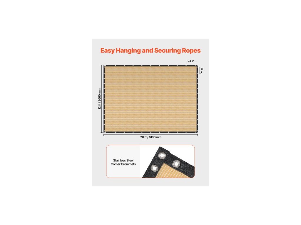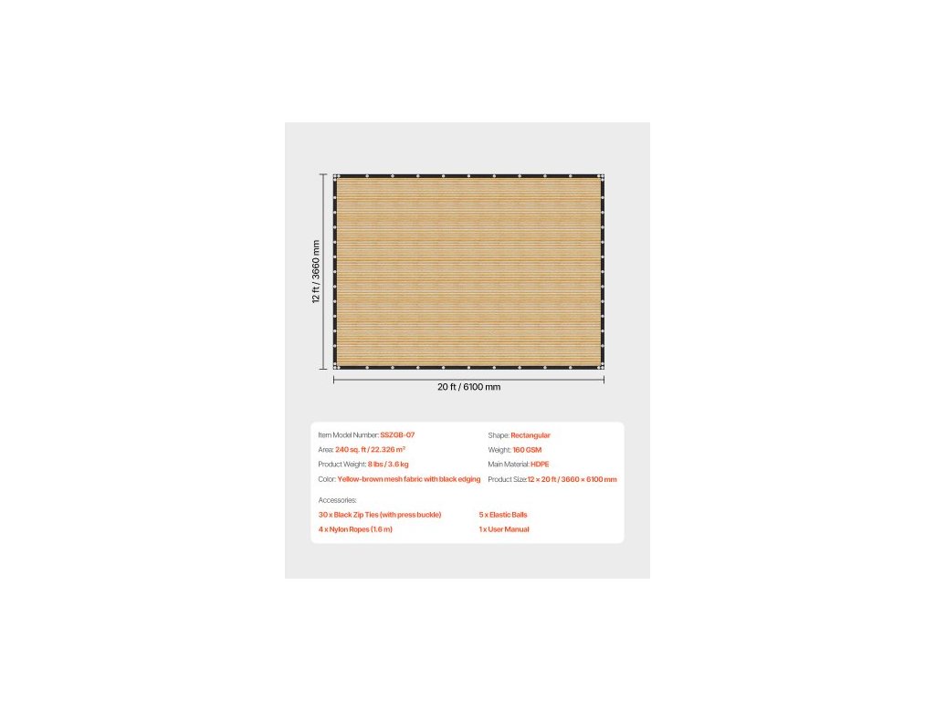 Plocha: 240 čtverečních stop / 22,326 m²,Tvar: Obdélníkový,Barva: Žlutohnědá síťovaná tkanina s černým lemováním,Číslo modelu položky: SSZGB-07,Hmotnost výrobku: 8 liber / 3,6 kg,Hmotnost: 160 g/m²,Hlavní materiál: HDPE,Rozměry výrobku: 12 x 20 stop / 3660 x 6100 mm
