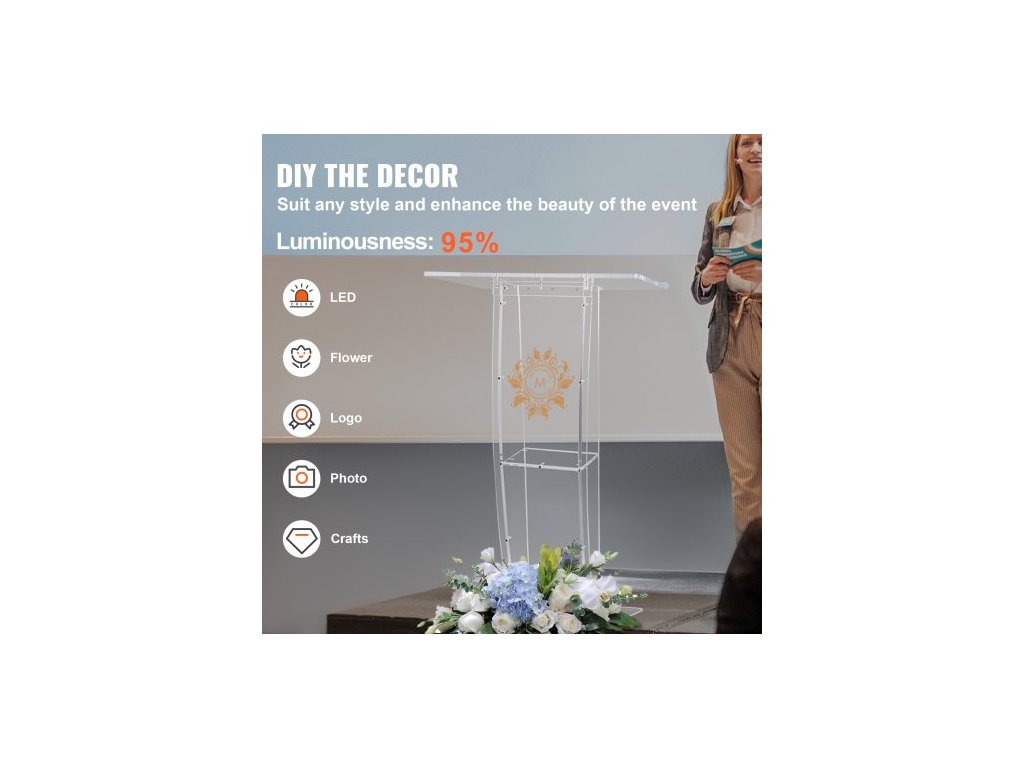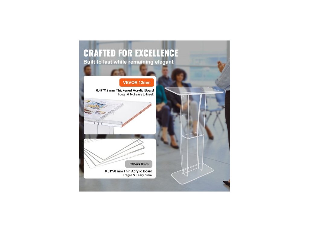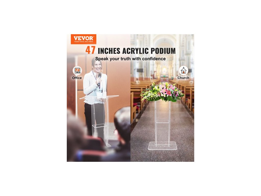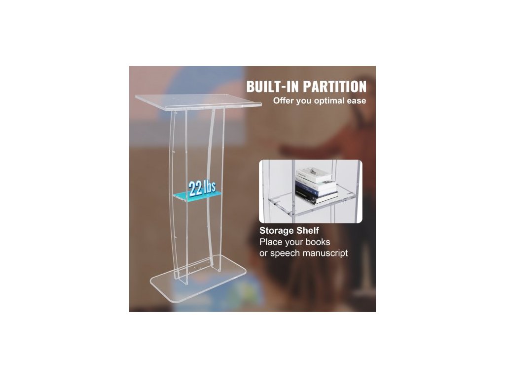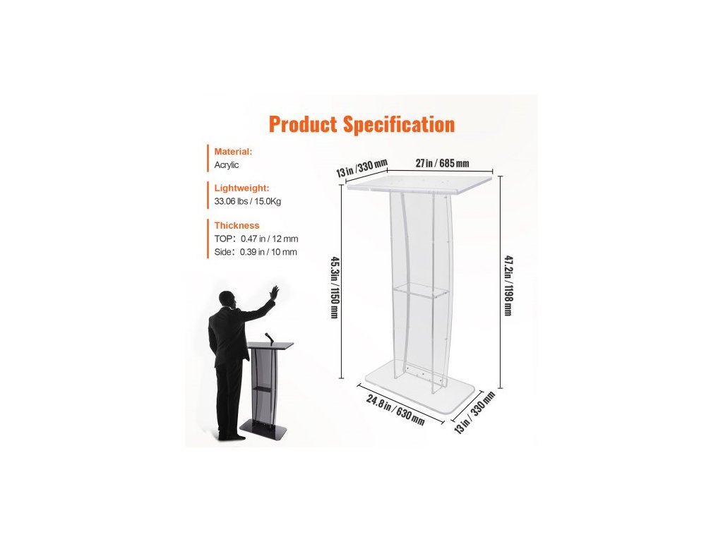 Akrylové pódium , výška 119 cm, čirý akrylový stojan na pódium se širokou čtecí plochou a úložnou policí, stojící na podlaze z čirého akrylu, pro kanceláře a školy, profesionální pódium, DIY dekorace, vyrobeno pro dlouhou životnost, velká pracovní plocha, úložná police, různé možnosti použití, rozměry boční desky: 1150x150x10 mm, hmotnost výrobku: 15,0 kg, rozměry horní desky: 685x330x12 mm, materiál: akryl, rozměry výrobku: 685x330x1198 mmDoplňkové parametry
